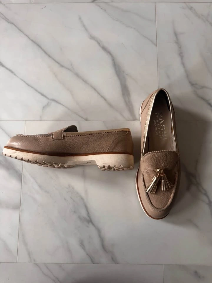 Elegant taupe leather loafers with decorative tassels. Gold-tone tassel hardware adds shine. Cushioned insole for everyday comfort. Versatile neutral for casual or dressy looks. Bought in Italy. Size EU 37.