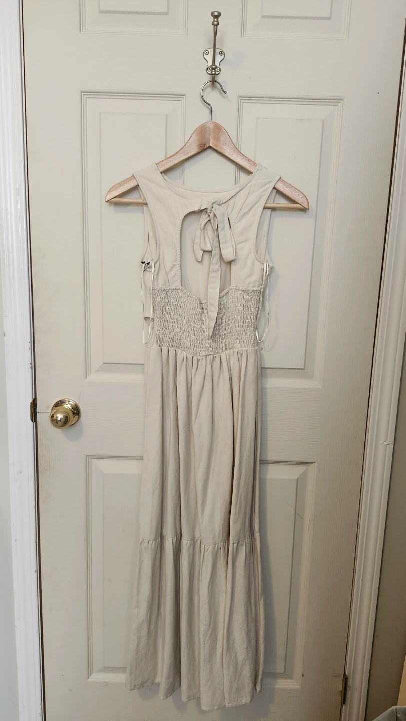 This cream-coloured maxi dress is made from a linen blend fabric. It features a sleeveless design with a smocked back panel and a tie closure at the back. The tiered skirt adds a lovely flow.