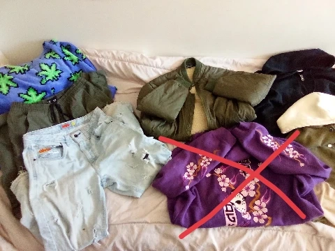 Bundle includes a green bomber jacket, a black zip-up hoodie, and light wash ripped denim shorts. The bomber jacket has a sherpa-lined collar. The hoodie is a standard fit. The shorts are a size 32.