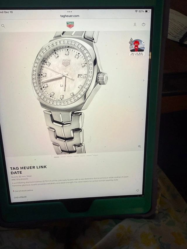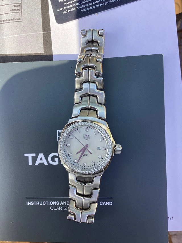 Buy & SellTAG HEUER LADIES DIAMOND WATCH, P.$6500 PRISTINETAG HEUER LADIES DIAMOND WATCH, P.$6500 PRISTINE$3,150This is a 100% authentic Tag Heuer ladies diamond watch. I paid $6500 CDN and it's only been worn once. It's in brand new condition. Cash is accepted.WHERE TO MEETCheck LocationView MapSELLERverifiedNancyBowmanville650 reviews0 chats·0 favorites·14 viewsSEND CHAT TO SELLERHi Nancy! I’m interested in your listing.Hi Nancy! I’m interested in your listing.Get the Karrot app to chatSign In to chat