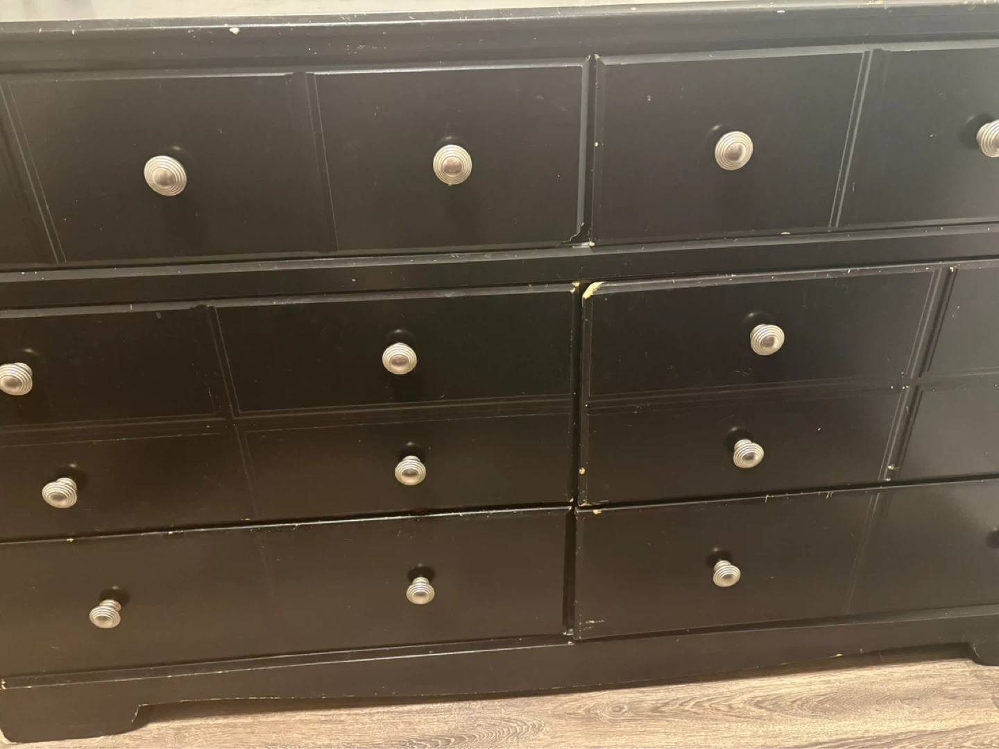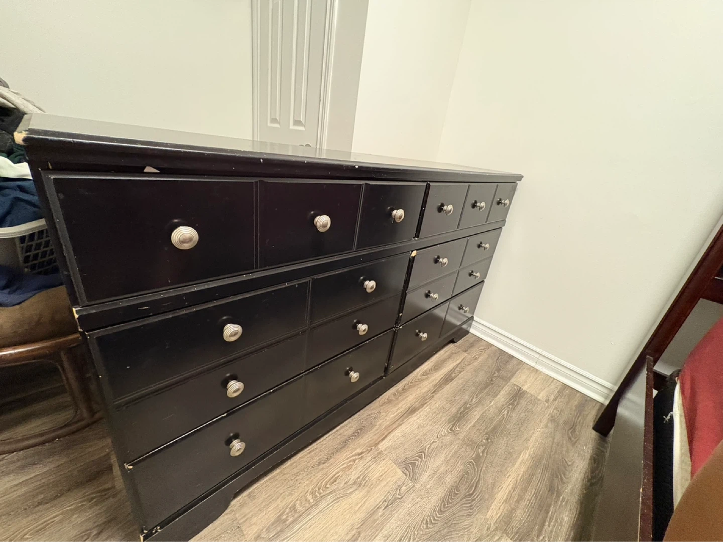 This is a black dresser with 6 drawers. Very deep drawers , all of dresser Is made of wood. In good condition, drawers all work smoothly, have no space for it anymore