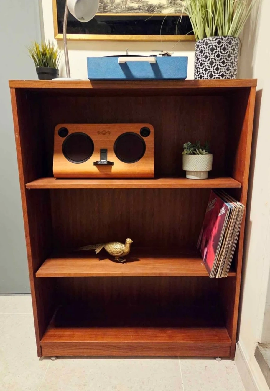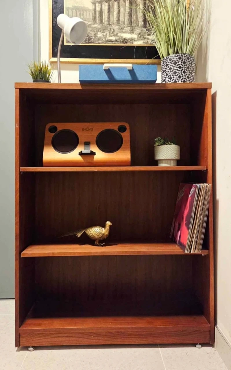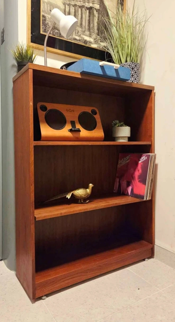 Mid century teak veneer bookcase with two adjustable height shelves.