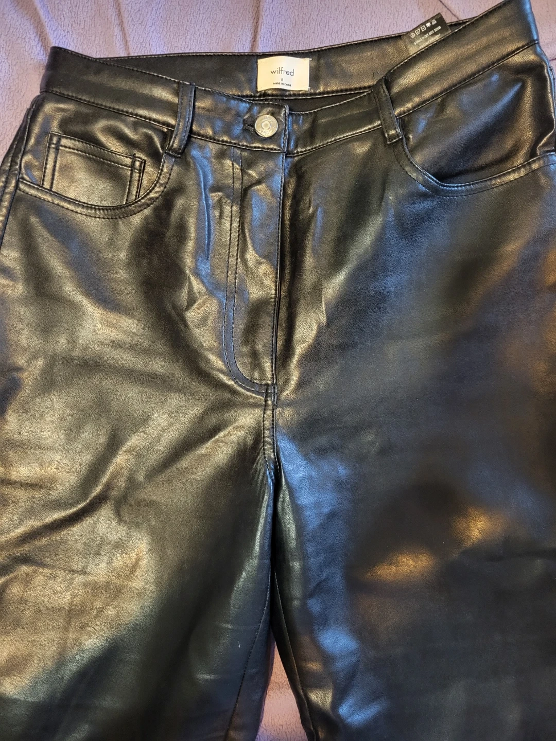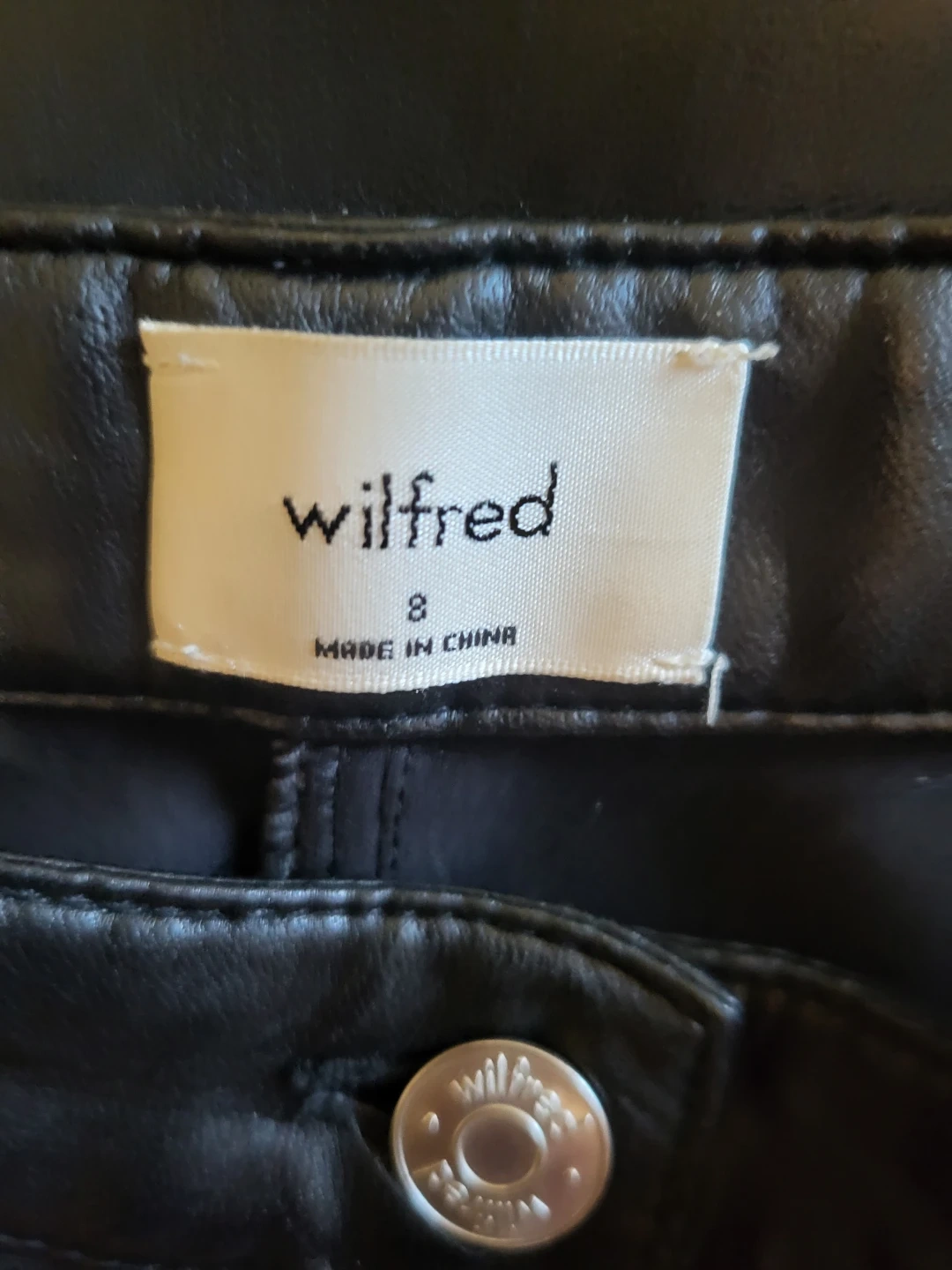 These black faux leather pants are from Wilfred. They're a size 8 The material looks like faux leather.