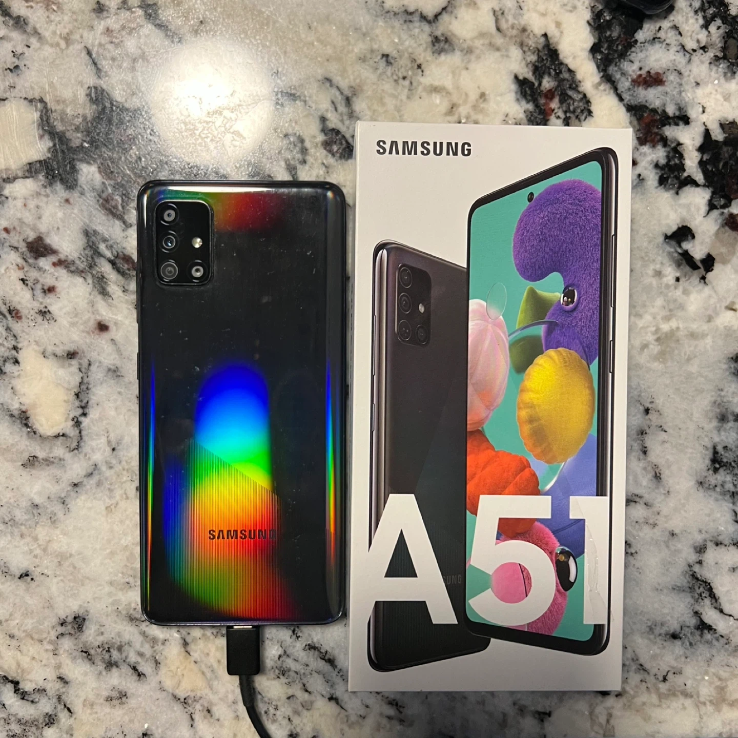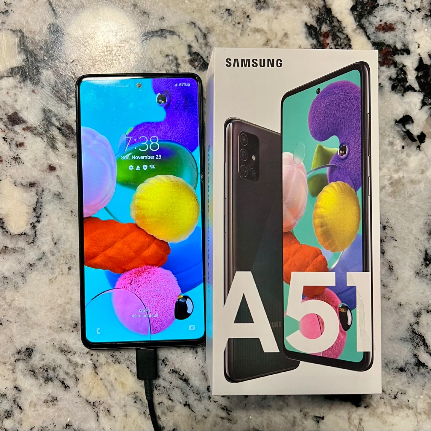 Selling a used Samsung Galaxy A51 in black. It's in good condition and comes with the original box.