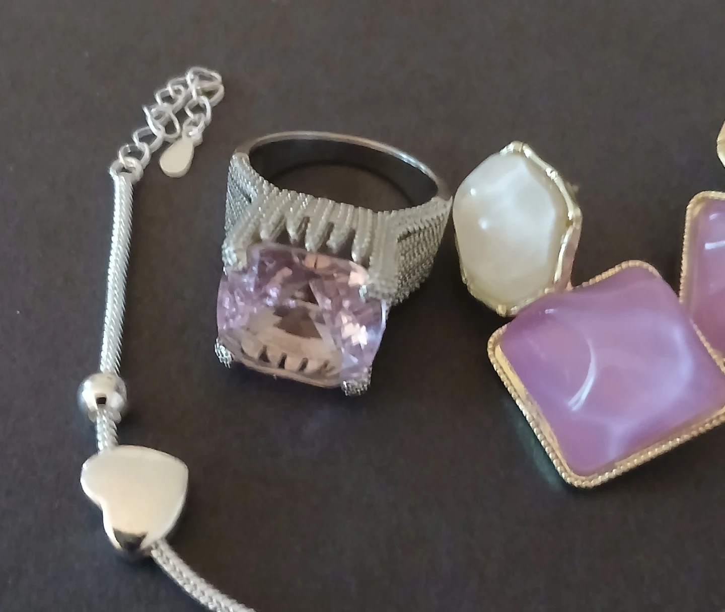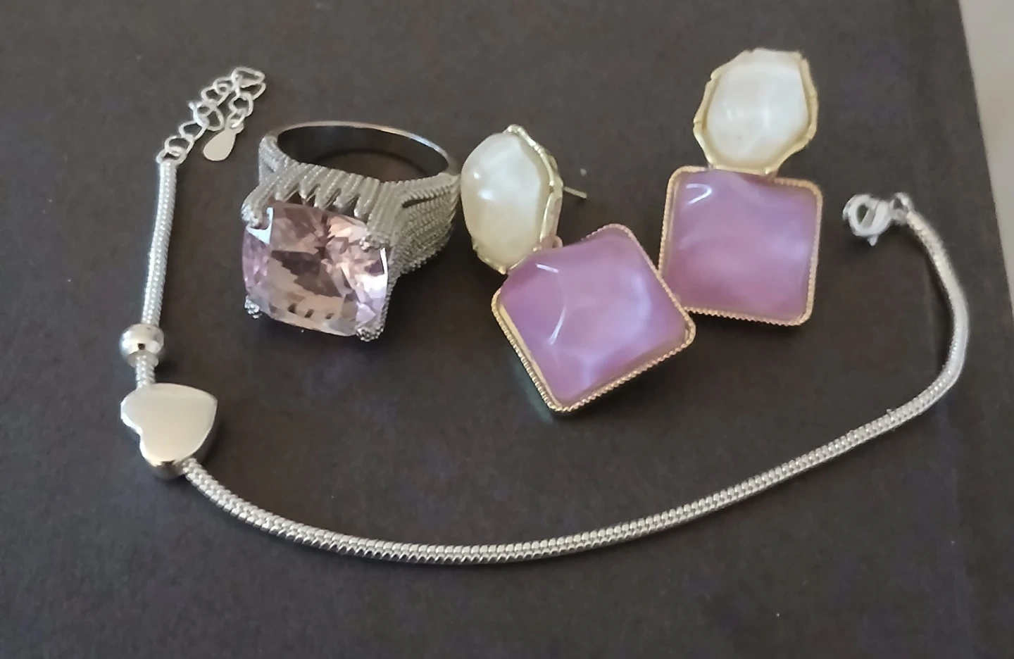 This jewellery set includes a ring with a large pink gemstone and a textured band. It also comes with a pair of earrings featuring white and purple square stones, and a delicate silver-tone bracelet with a heart charm. These pieces are silver-toned metal.
