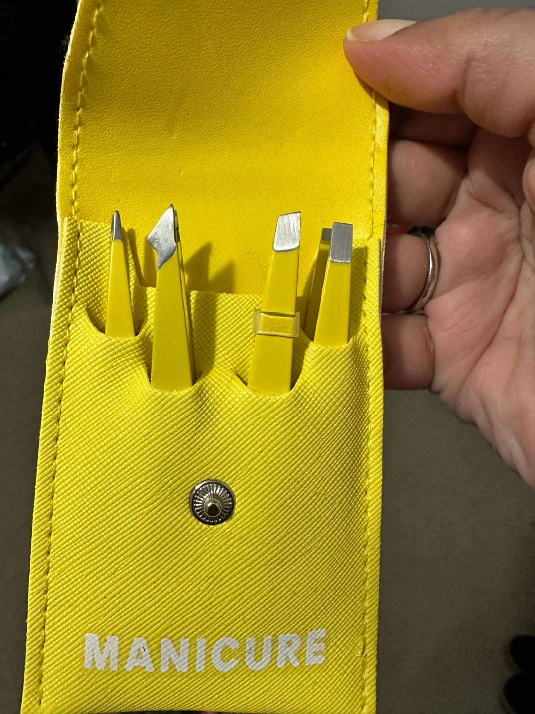 Four-piece manicure set. Yellow carrying case. Includes different sized tweezers.