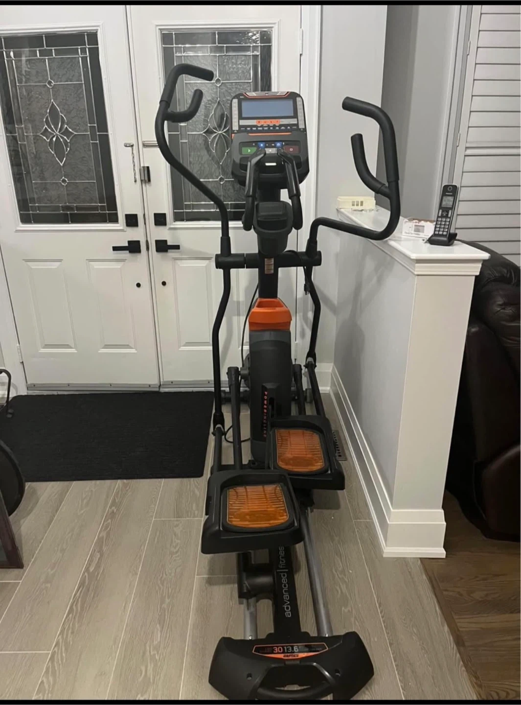 NordicTrack elliptical machine with a digital display and adjustable resistance. It has orange pedal grips and a water bottle holder. This machine is great for a full-body workout at home.