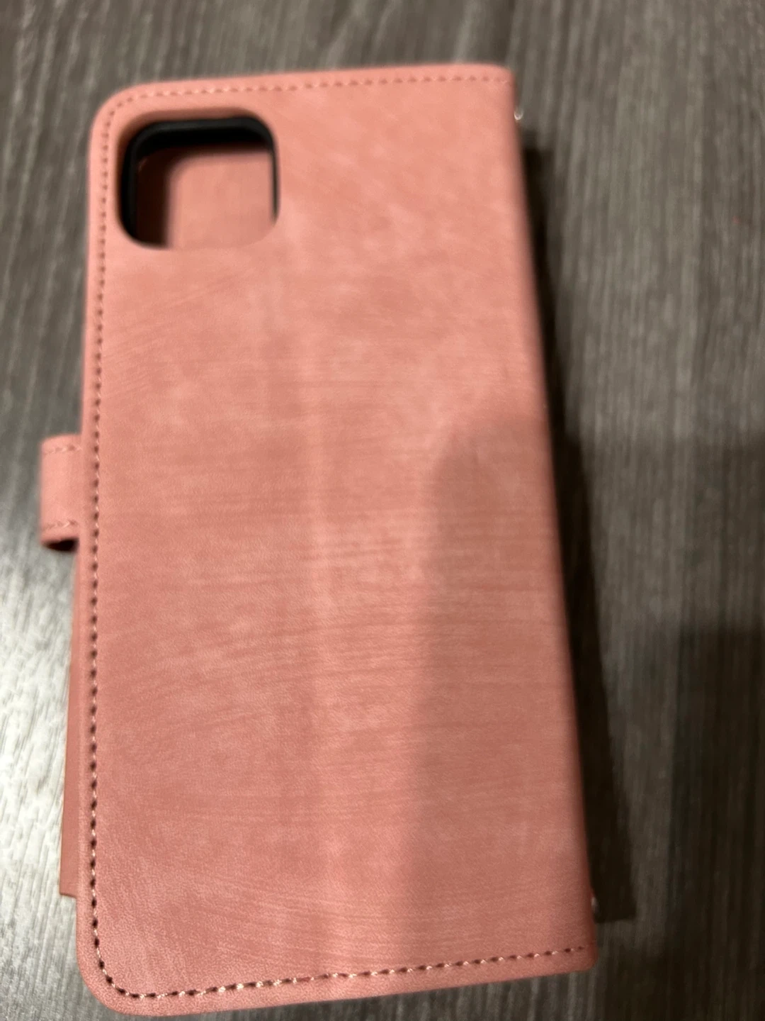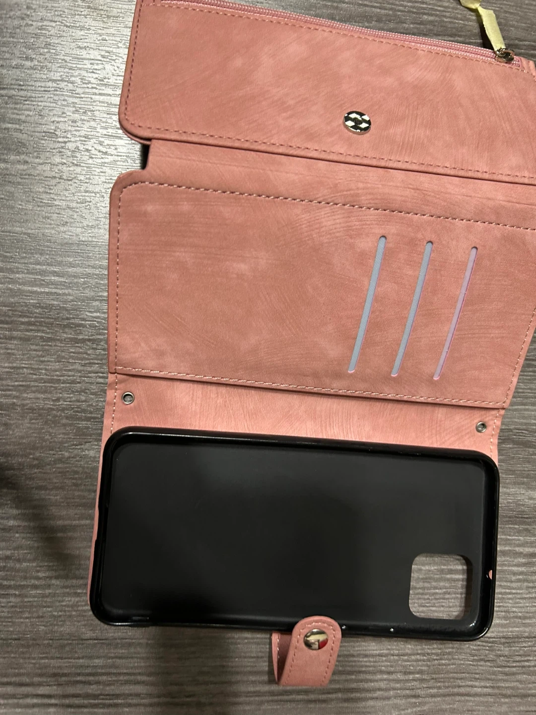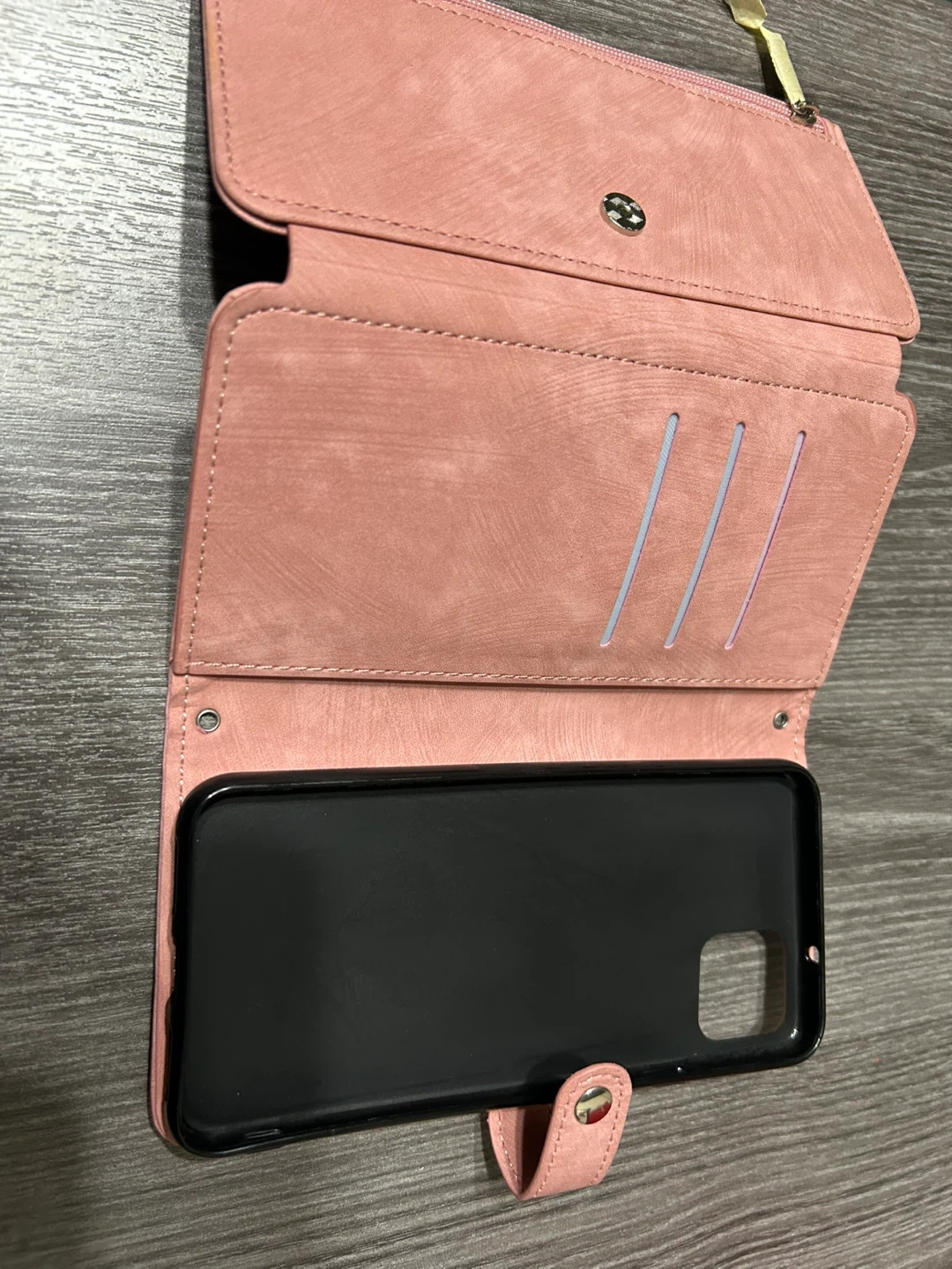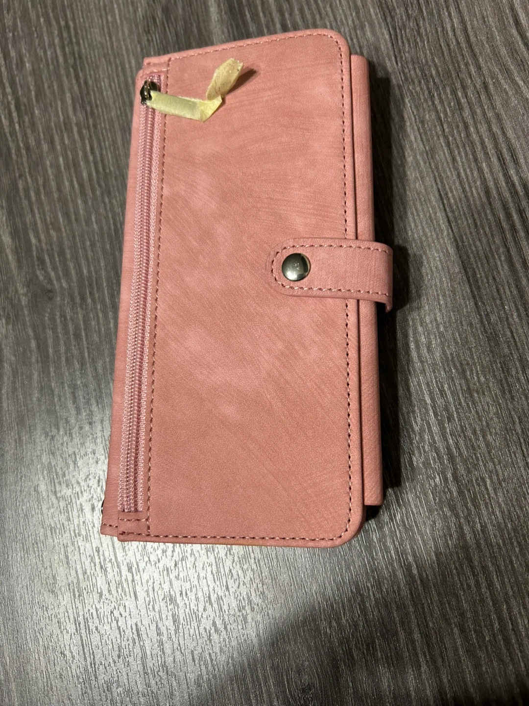 This wallet phone case is made from a soft pink faux leather material. It features multiple card slots and a zippered pocket. The interior has a secure snap closure to keep everything in place.