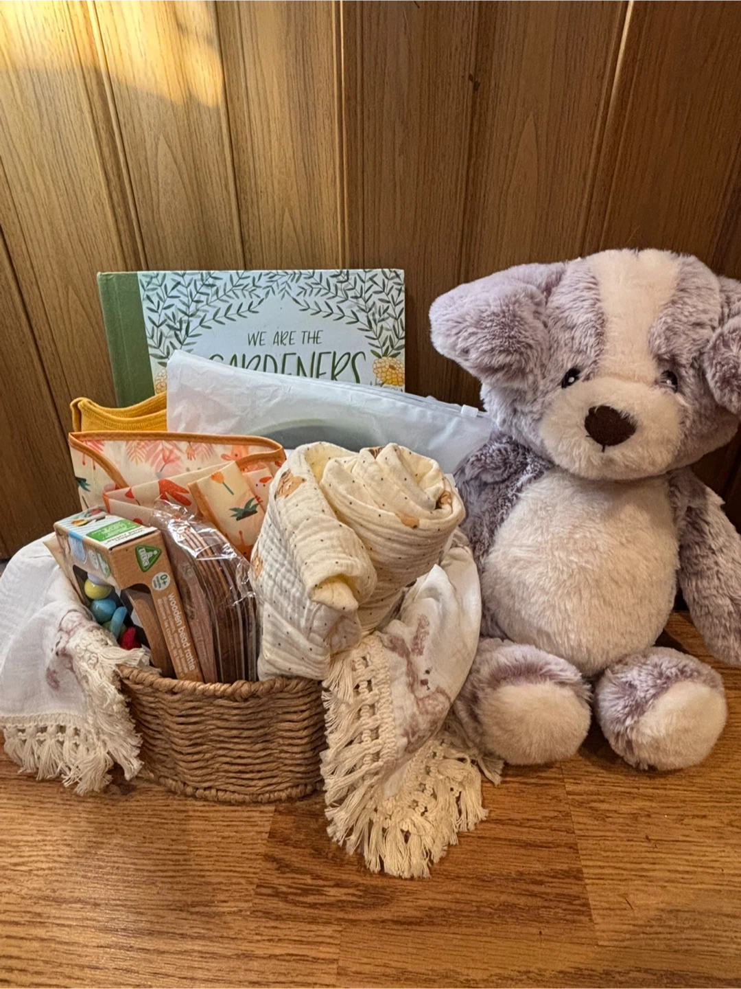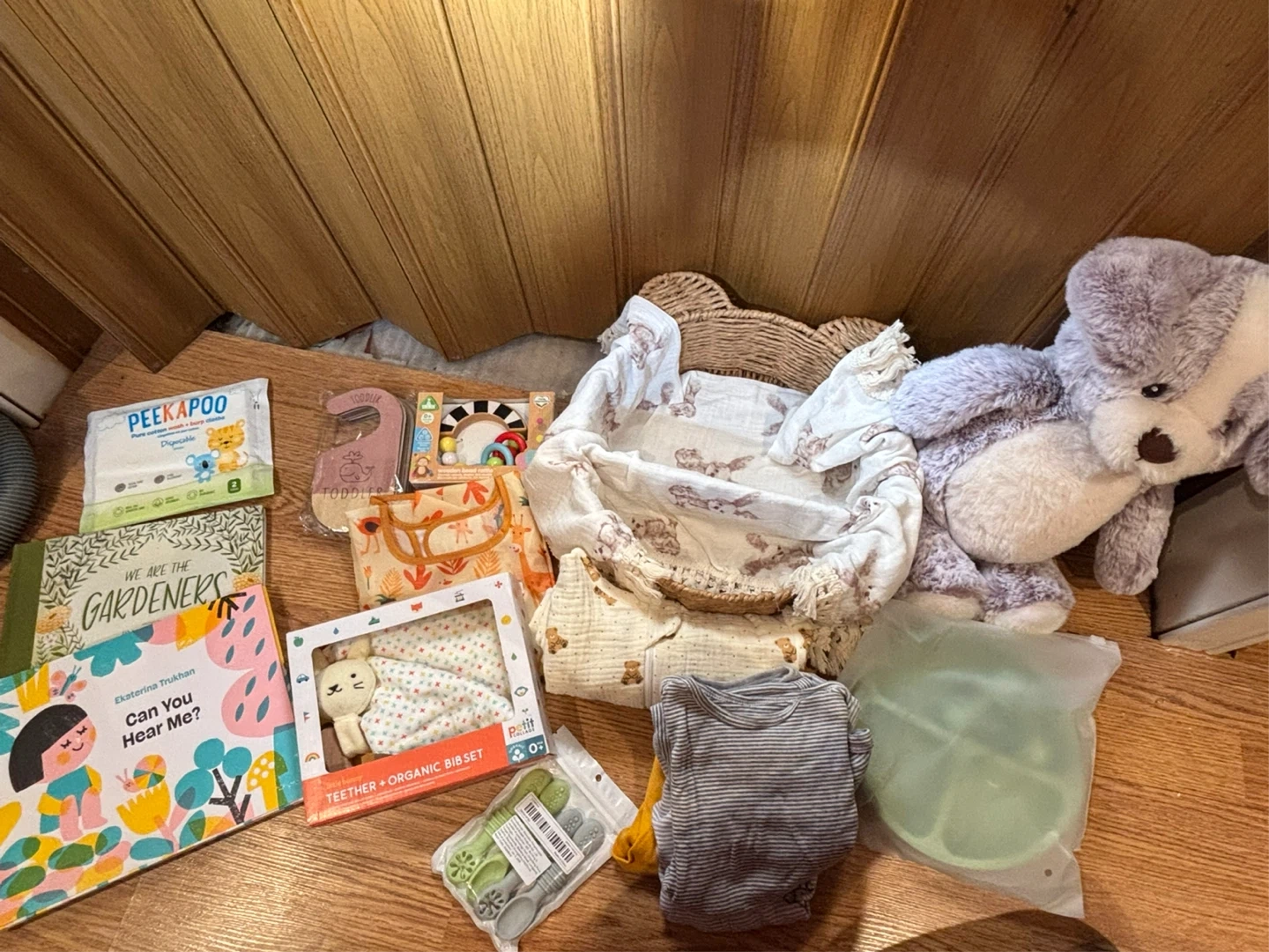 Includes• Large plush teddy bear• “We Are the Gardeners” book• Can you hear me book•Organic teether & bib set• Muslin swaddle blanket• Baby outfit• Wooden toy• Age hanging dividers• Peekapoo wipes• Wearable bib• Wooden toy Silicone divided baby plate• 4 Silicon spoons• Decorative storage basket that is a bear shelve