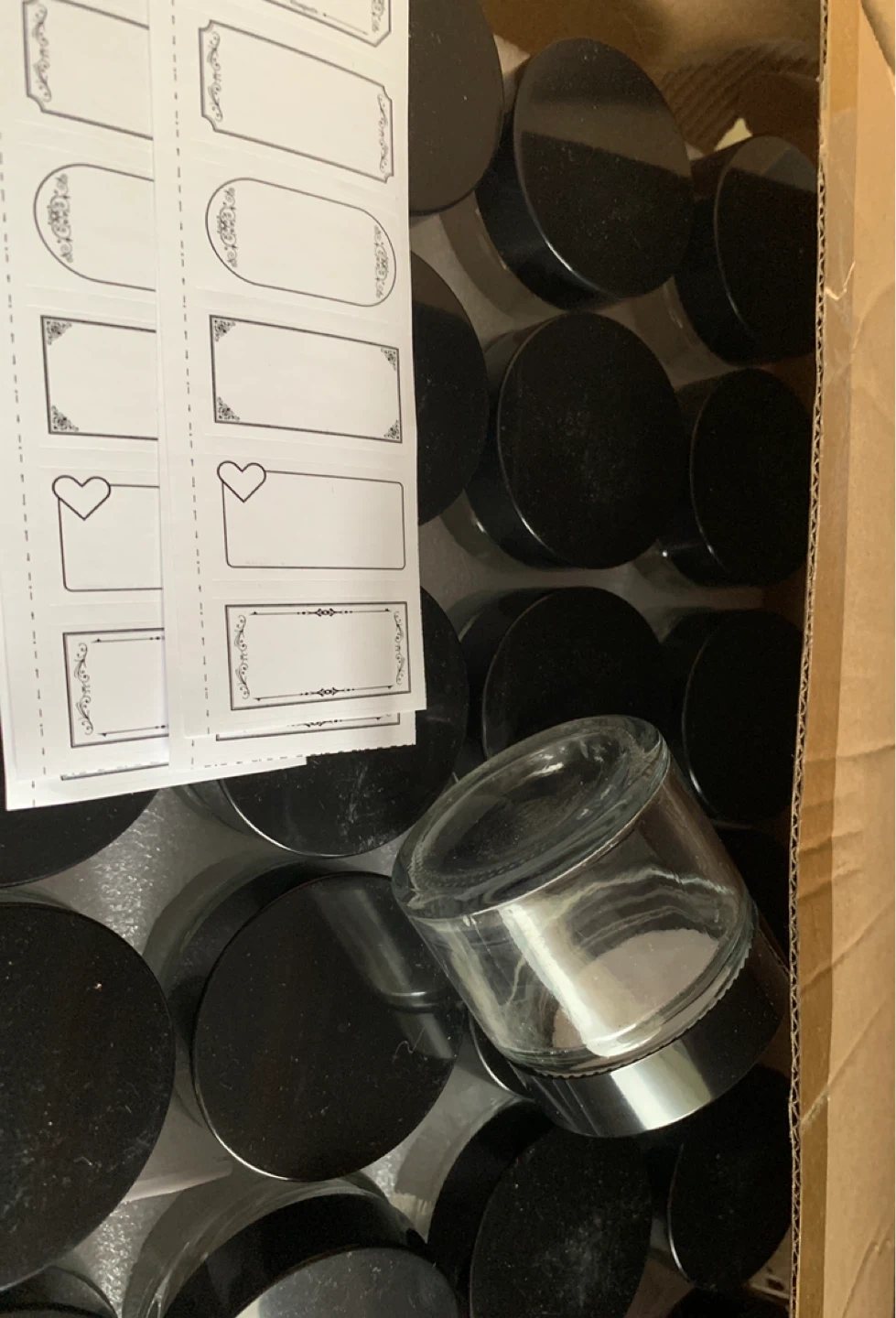 Comes with a pack of small glass jars, each with a black screw-on lid. Includes a sheet of decorative labels for personalization. Perfect for storing small items or for DIY projects! , Brand New