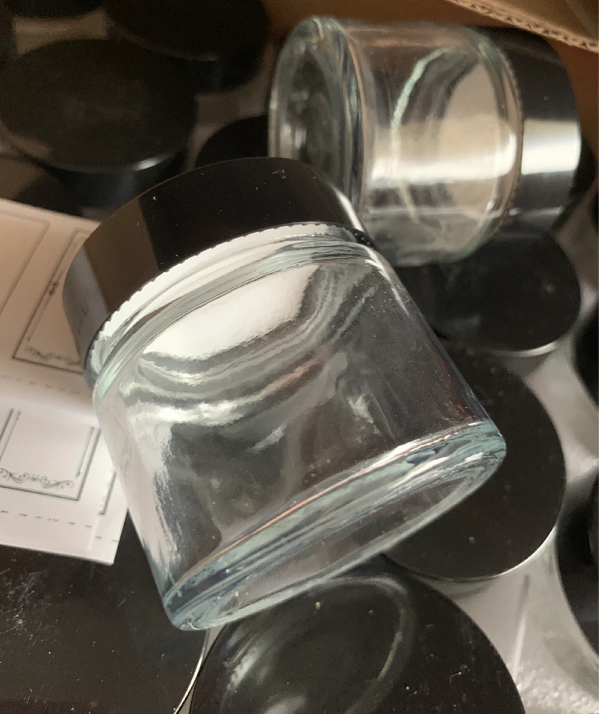 Small Glass Jars with Black Lids and Labels