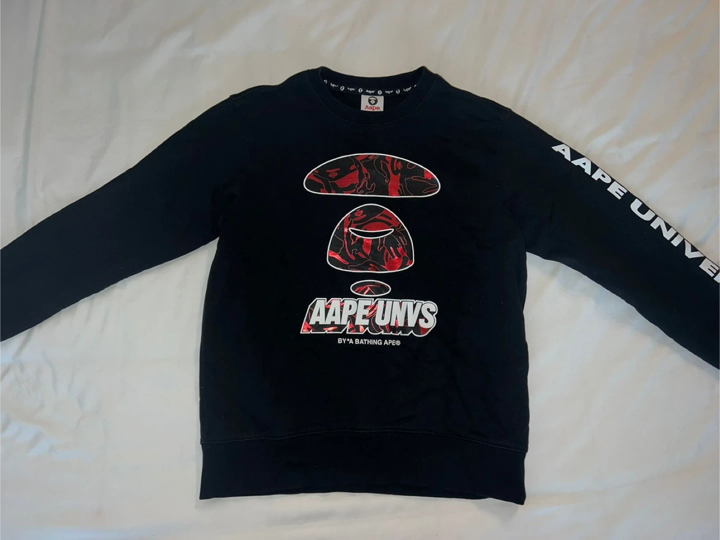 Selling a black AAPE by A Bathing Ape sweatshirt. It features the iconic AAPE logo on the front and 'AAPE UNIVS' on the sleeve. The material is soft and comfortable, perfect for everyday wear. It's in great condition!
