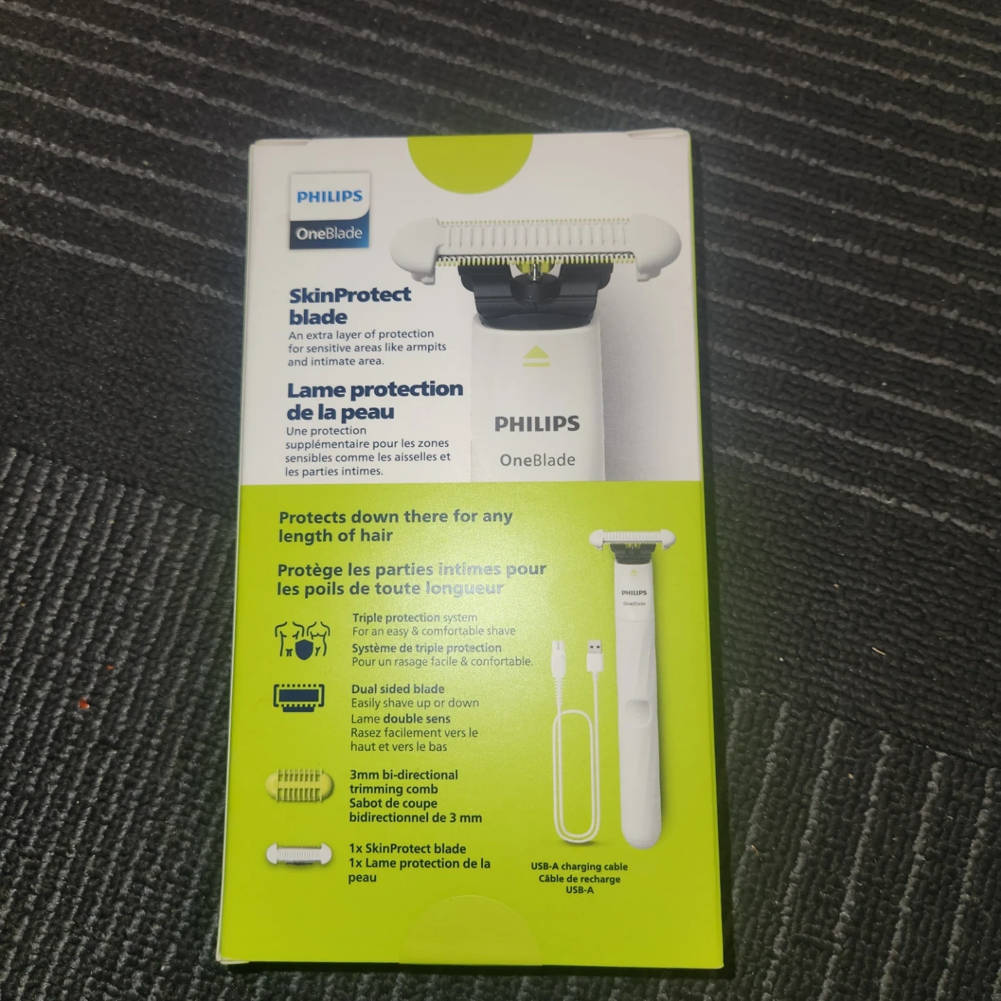 Philips OneBlade with SkinProtect blade for sensitive areas and intimate use. It's designed for shaving and trimming hair of any length. Includes a USB-A charging cable and a 3mm bi-directional trimming comb.