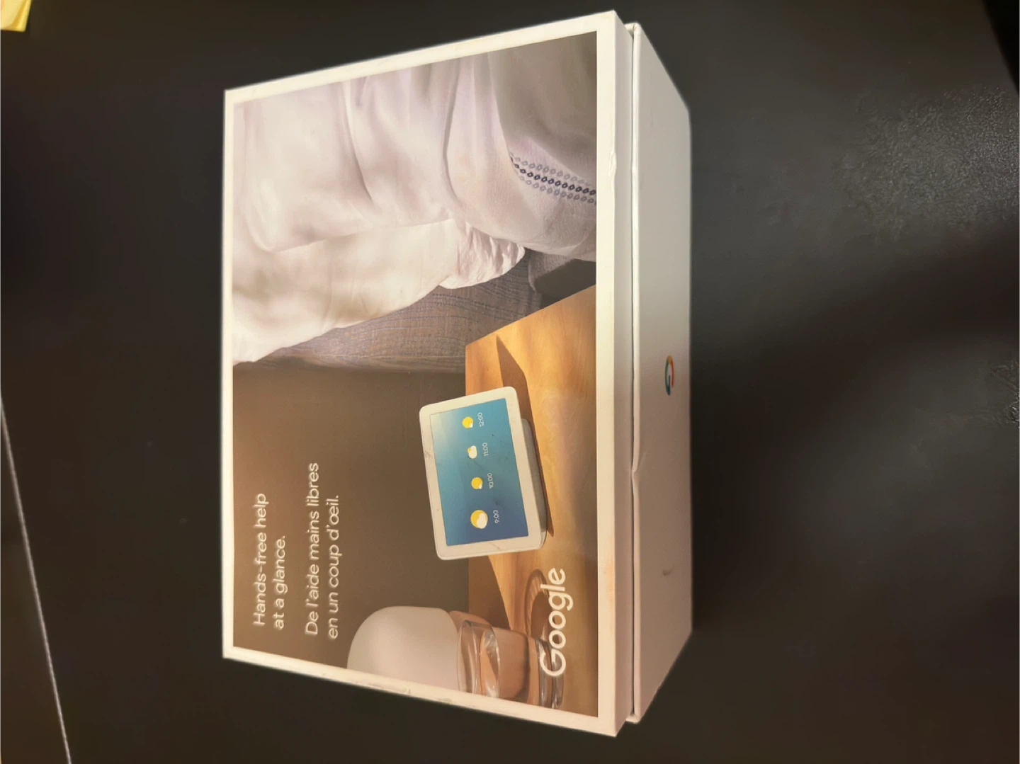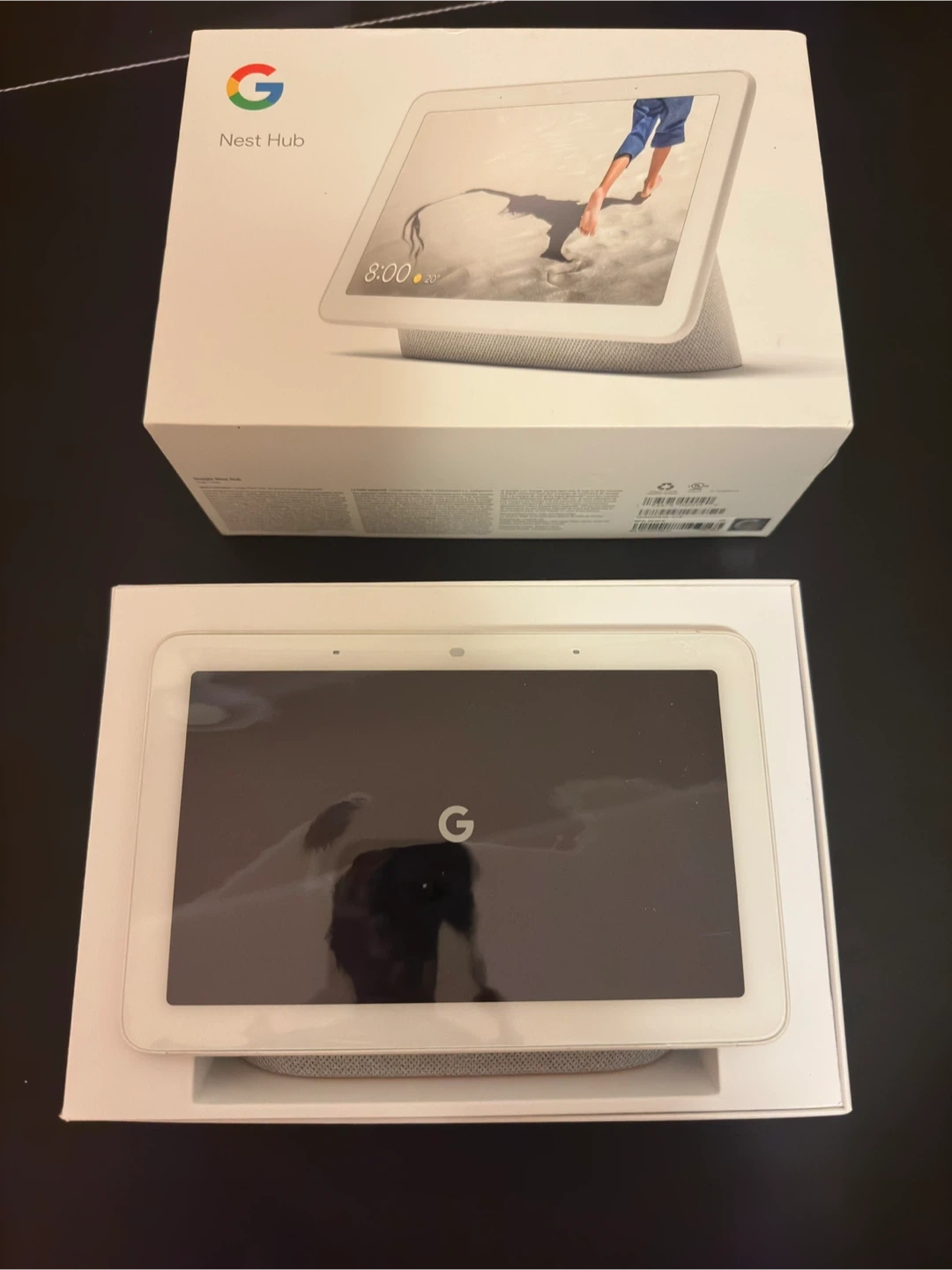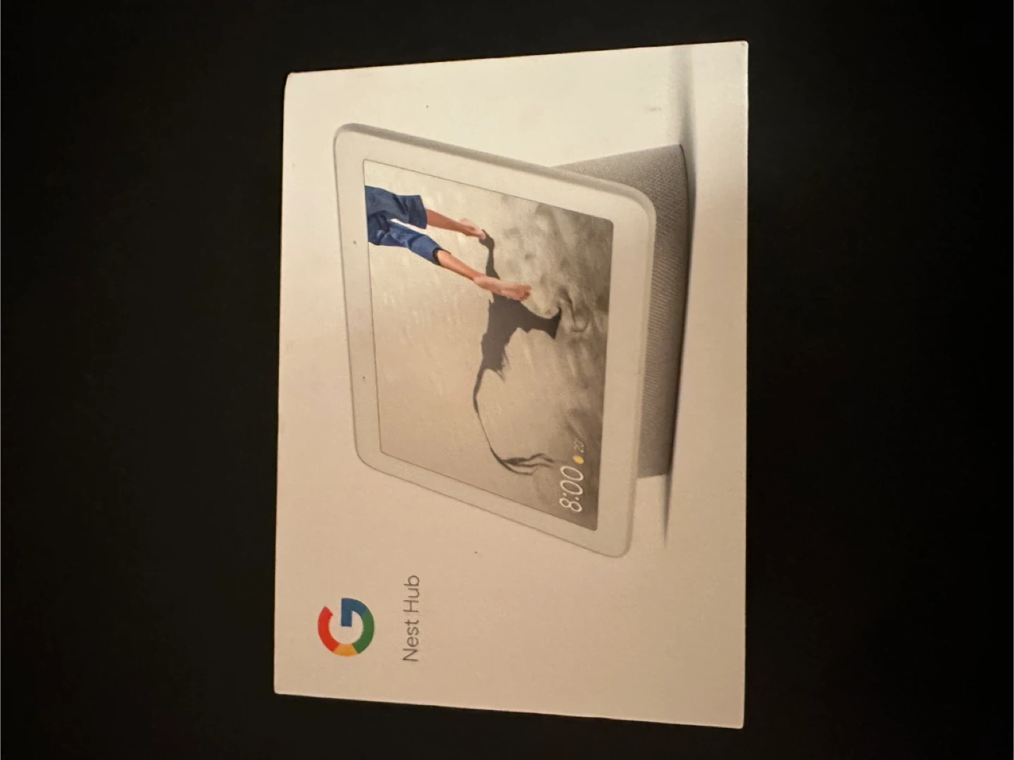 This is a Google Nest Hub smart display. It's designed for hands-free help and information at a glance. The device connects to Wi-Fi and works with Google Assistant. Its screen shows time, weather, and other visuals.
