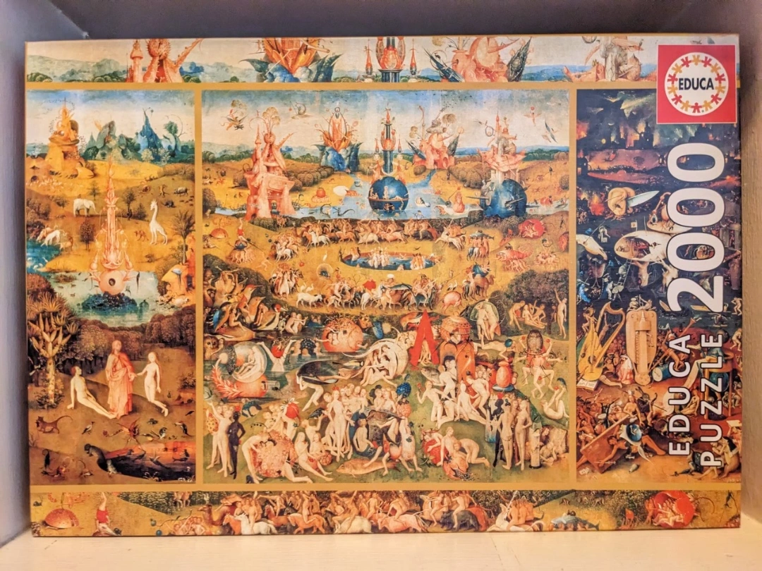 Selling a 2000-piece Educa jigsaw puzzle featuring the "The Garden of Earthly Delights" triptych by Hieronymus Bosch. It's still sealed in its original packaging. Enjoy putting together a piece of delightfully strange art history!