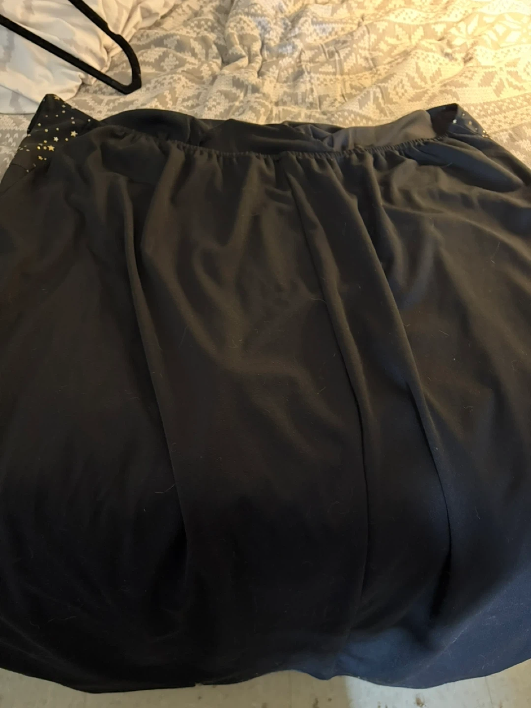 A black halter dress with gold stars around the chest and straps. Has elastic back so could possibly fit bigger.