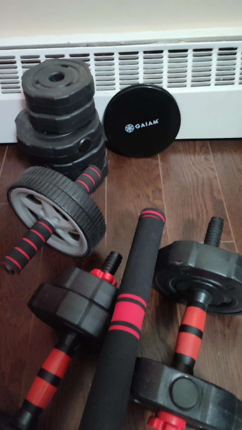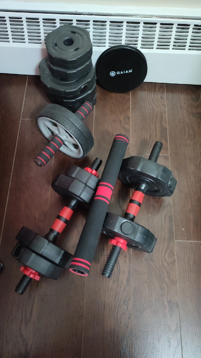 Selling a set of home workout equipment! Includes an ab wheel, a pair of adjustable dumbbells with weight plates, and a core slider
