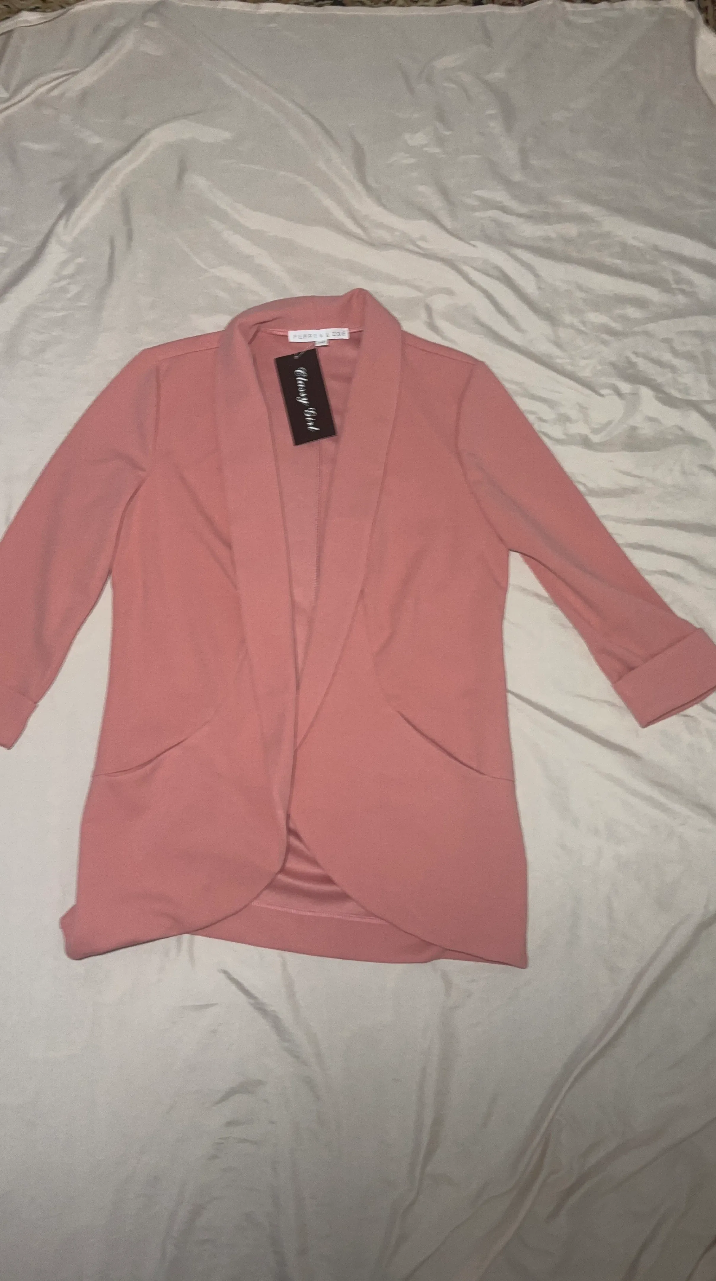 This Classy Girl blazer is a lovely shade of pink. It's an open-front style with two front pockets. The material looks like a soft knit. This piece is perfect for layering over tops or dresses!