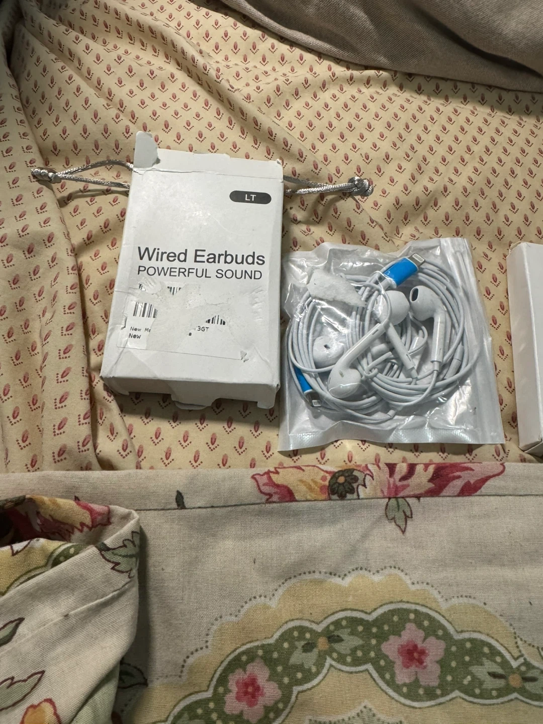 White wired earbuds with a Lightning connector. They offer powerful sound and are designed for Apple devices. Includes a drawstring pouch for storage.20/ dollar each
