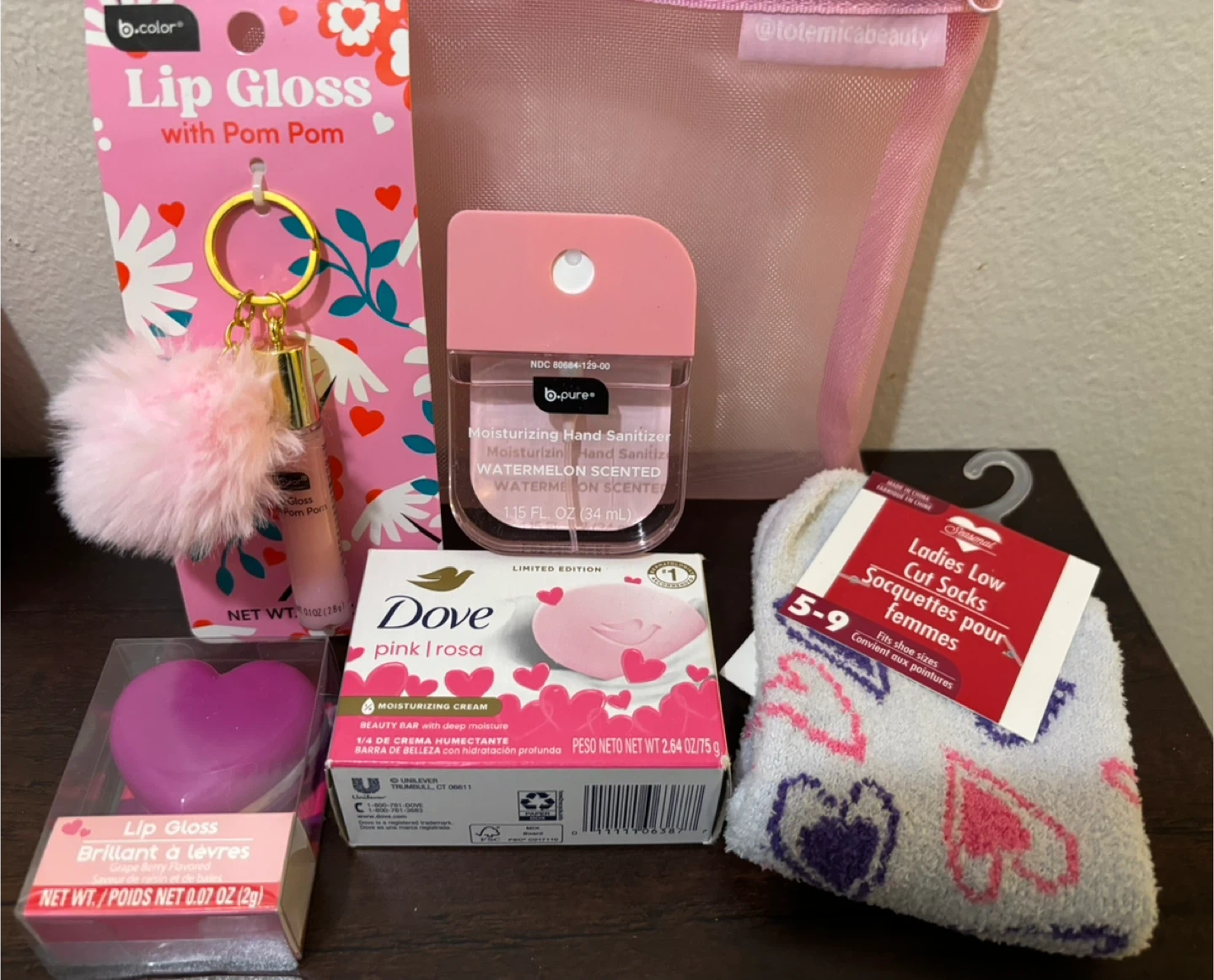 This set includes a b.color lip gloss with a fluffy pink pom pom keychain and a limited edition Dove pink moisturizing beauty bar. Also features a b.pure watermelon scented hand sanitizer and a pair of ladies low cut socks and another lip gloss. Great for gifting!