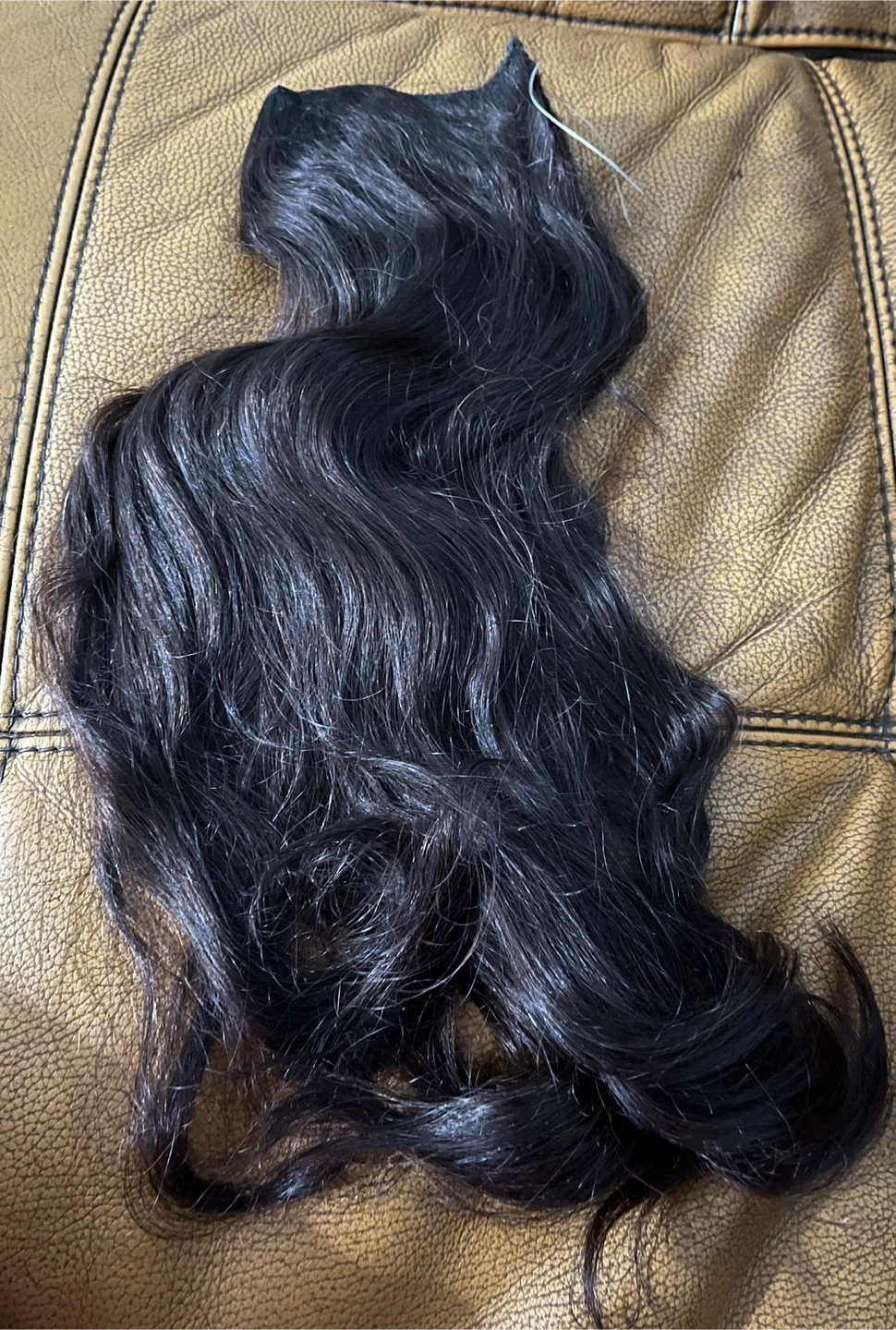 YOUNGSEE 100% real human hair extensions in black. These clip-in extensions are great for adding length and volume to your hair. Includes a set of clip-in hair extensions and accessories.