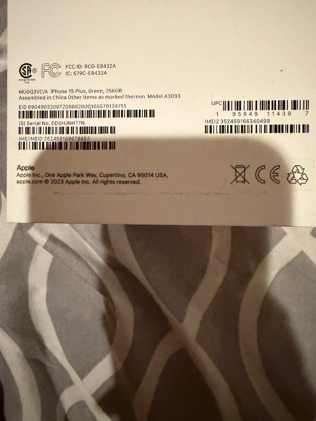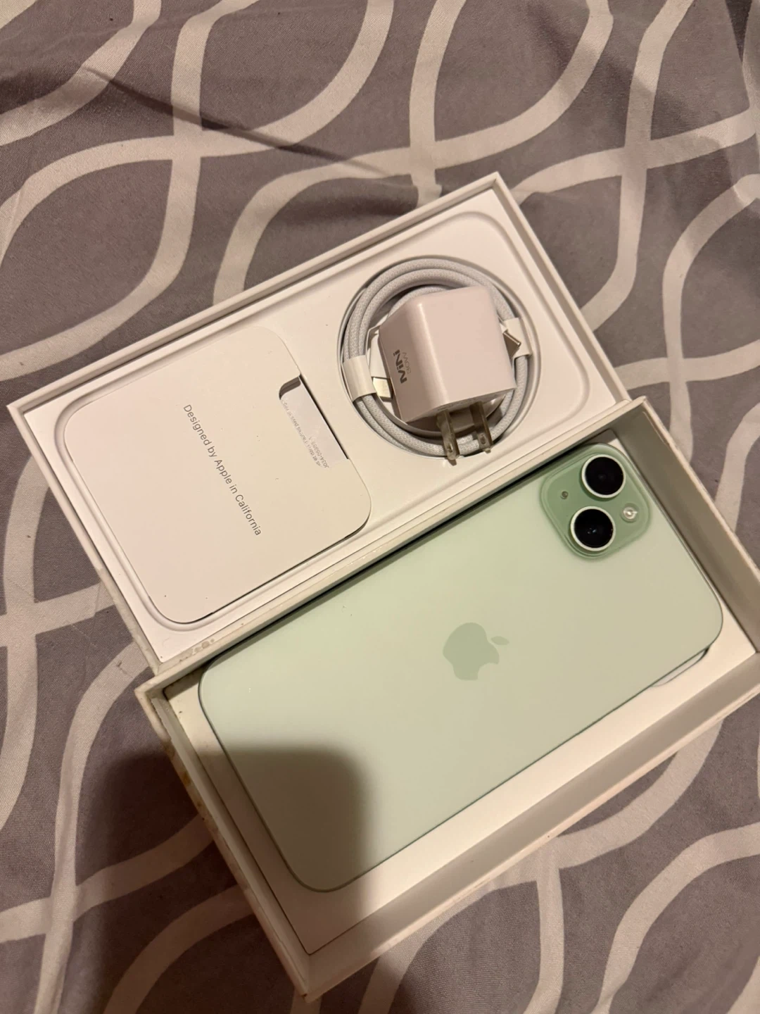 This is an Apple iPhone 15 Plus in green with 256GB of storage. It's a brand new device, still sealed in its original box, and comes with the charging cable and power adapter. It's a great phone for everyday use!