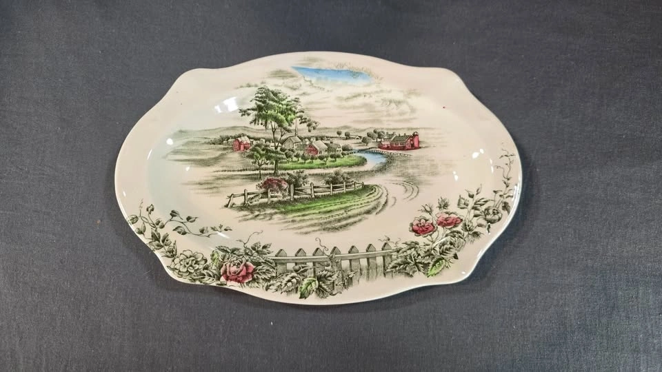 This transferware pattern features charming rural English scenes depicting village life, including orchards, mills, and pastoral landscapes.