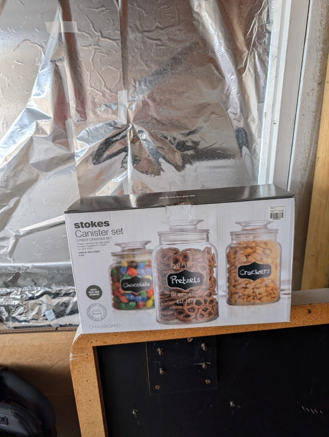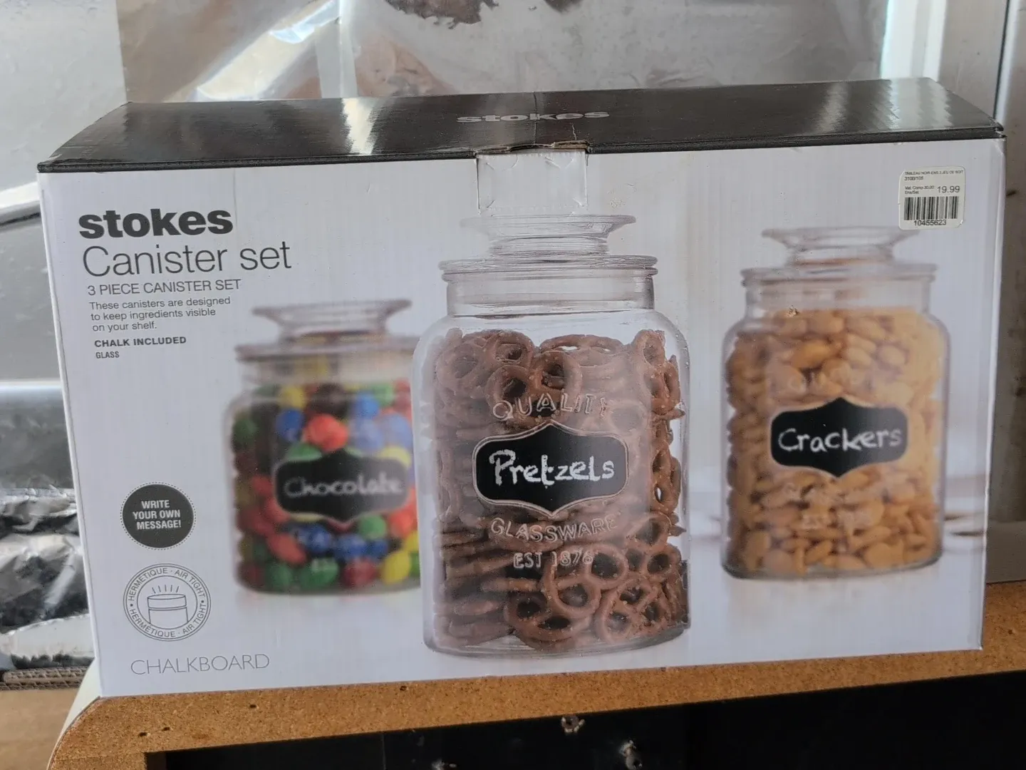 This is a Stokes 3 piece canister set. It's made of glass. These canisters are designed to keep ingredients visible on your shelf. Chalkboard labels are included!