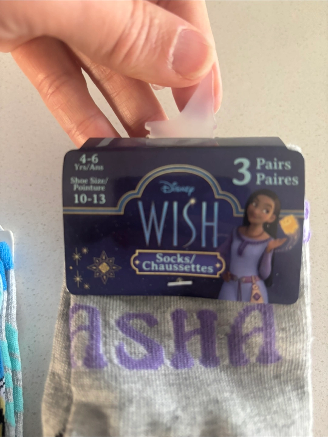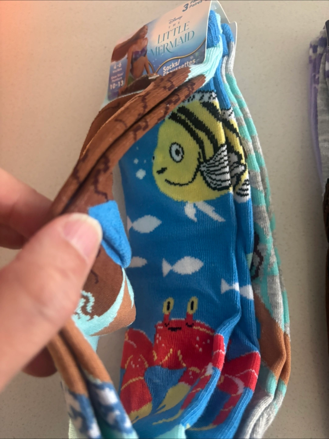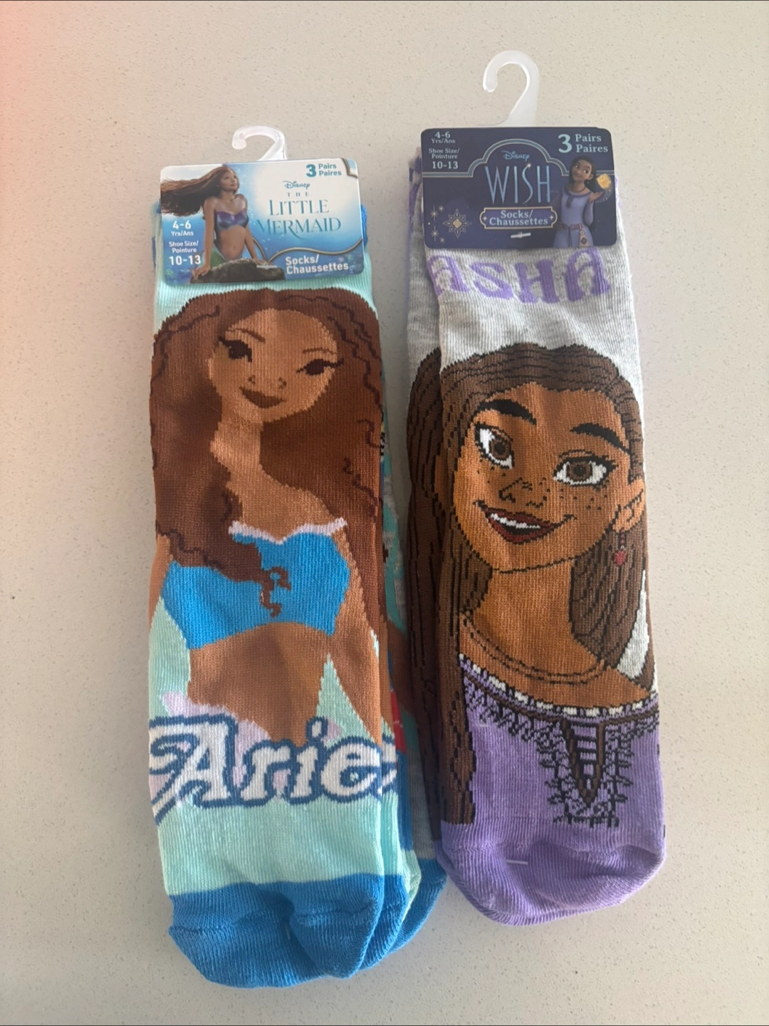 Three pairs of Disney themed socks. Includes two pairs from The Little Mermaid and one pair featuring Asha from Wish. Sized for ages 4-6 years, shoe size 10-13. Perfect for young Disney fans!
