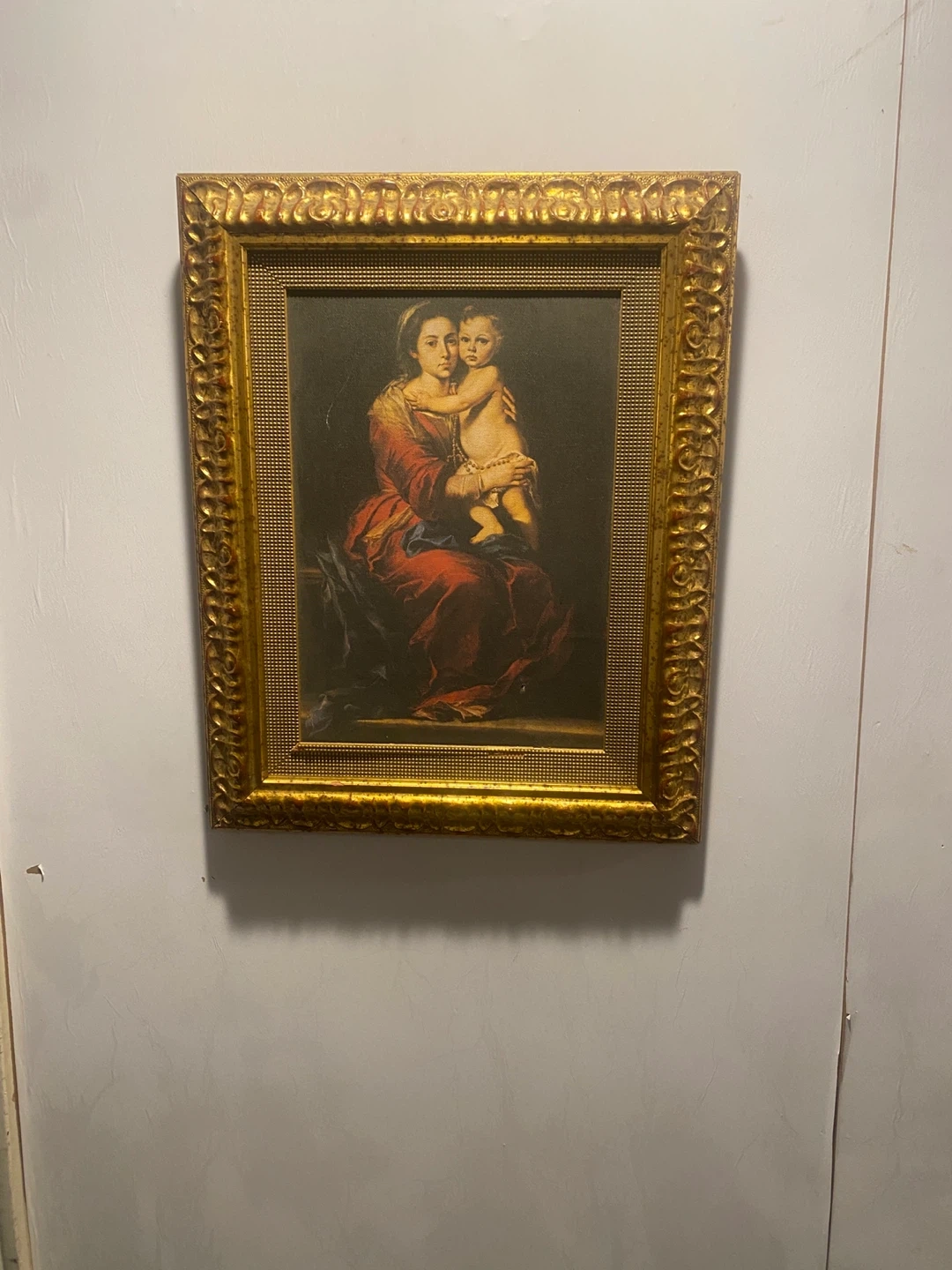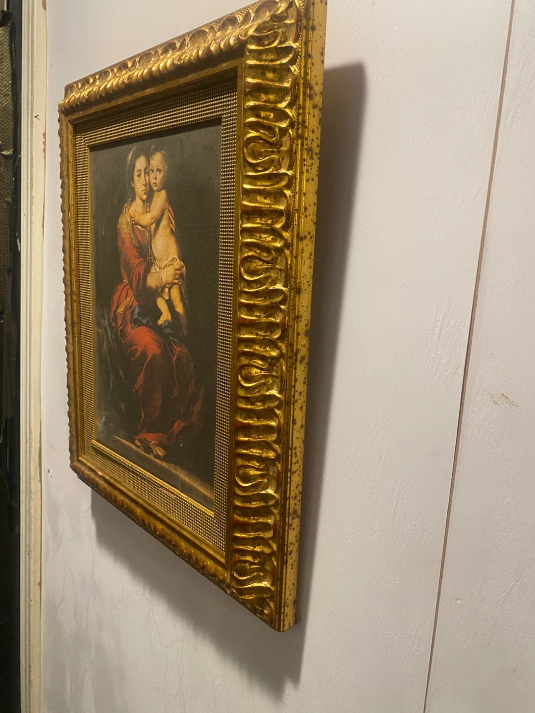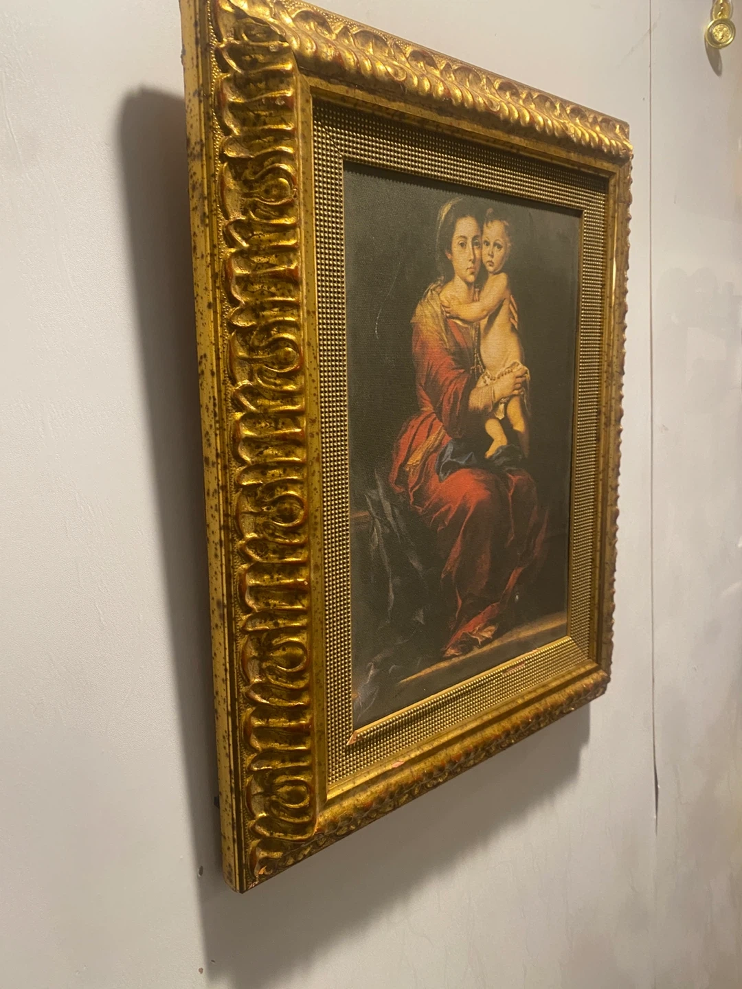 Add a touch of classic art to your home with this framed Madonna and Child painting. This is a used piece, but it is still in great condition with a beautiful, ornate gold frame.