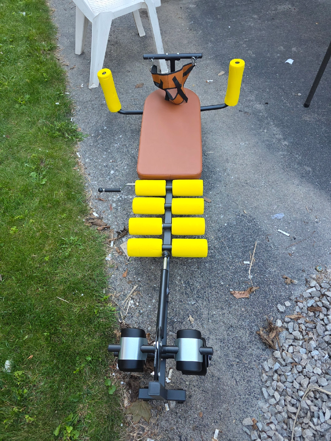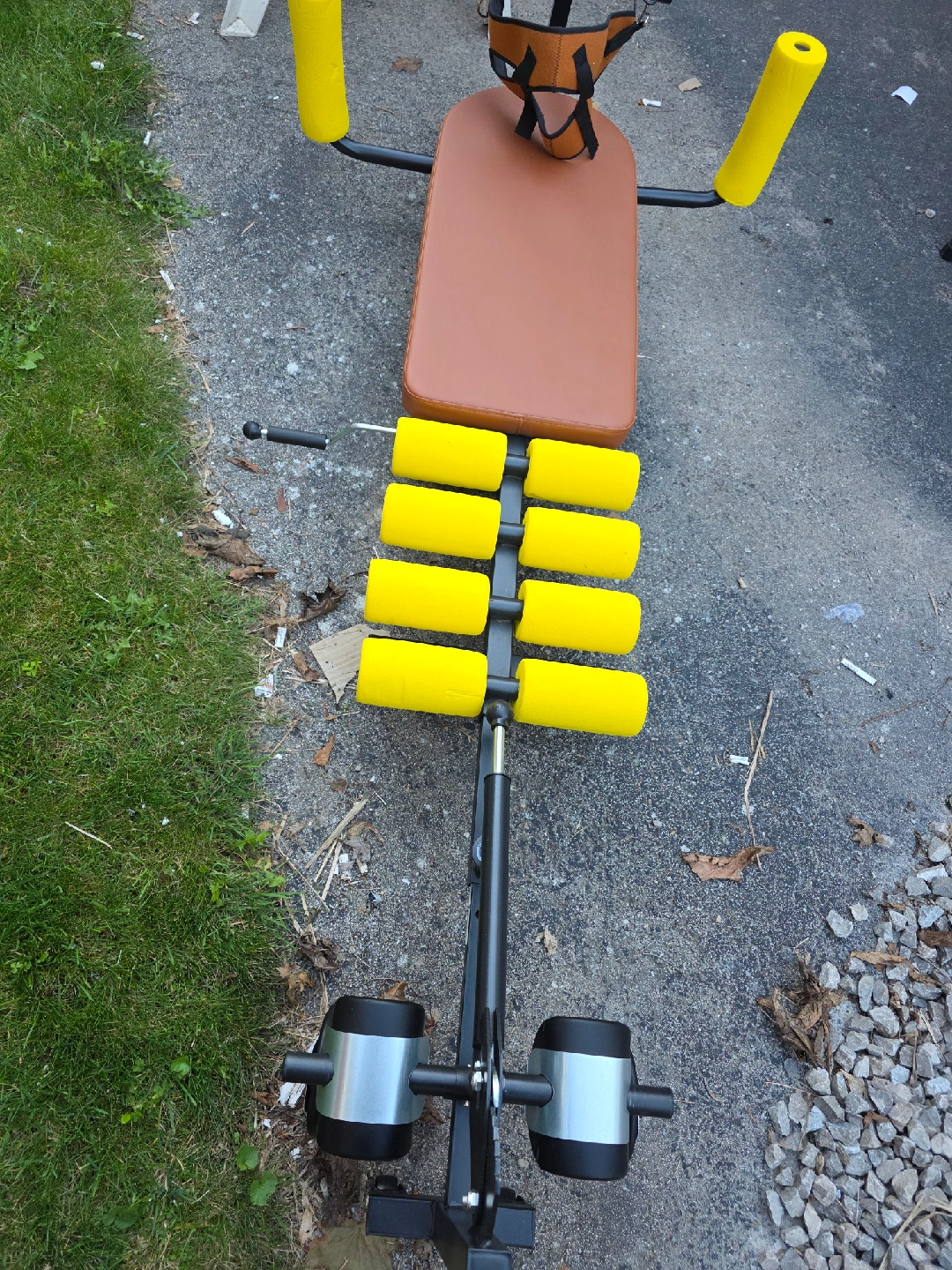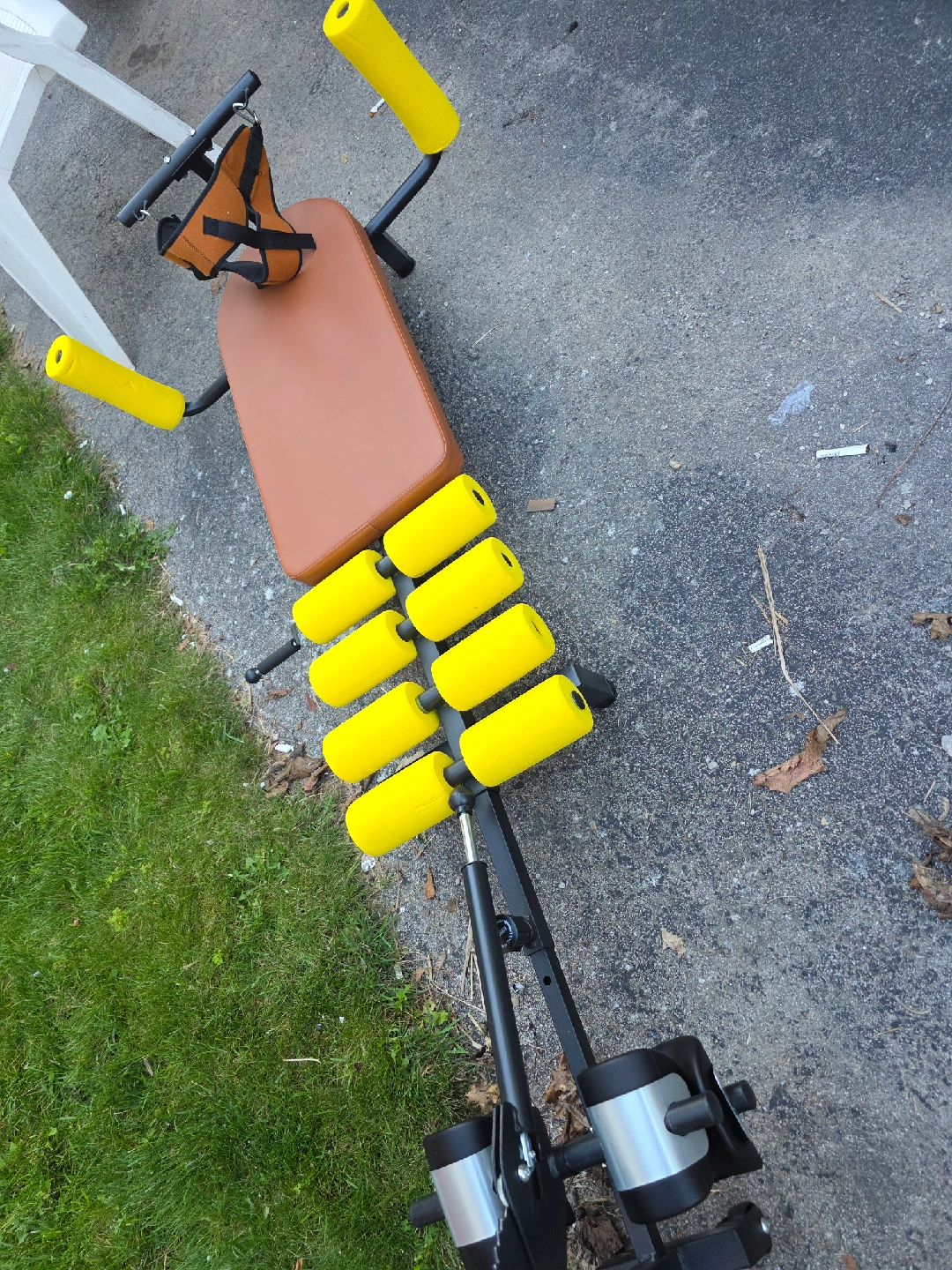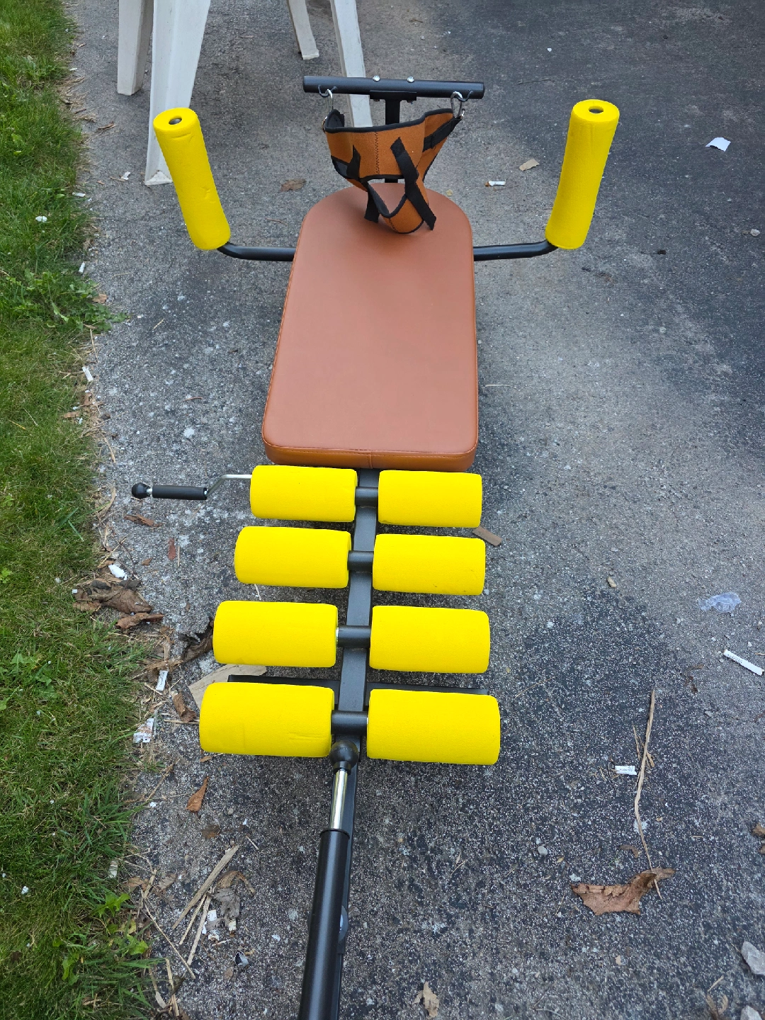 Selling an abdominal exercise bench! It has a brown seat and yellow rollers. It appears to be in good condition and ready for a new home. Get ready to work on those abs!