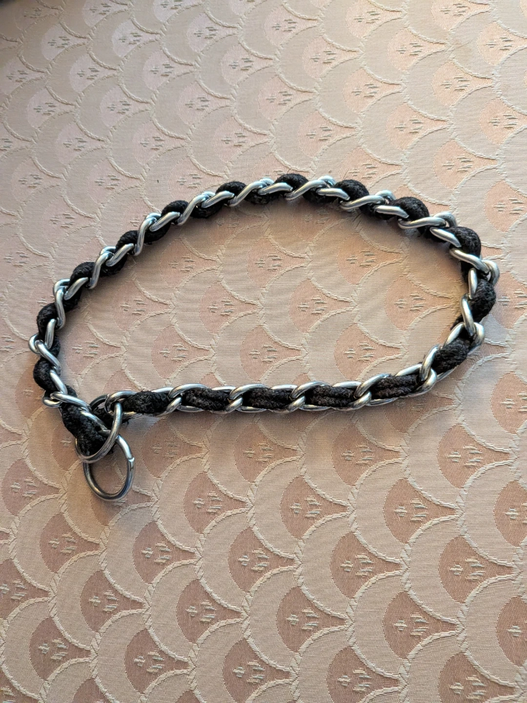 This collar features a braided black rope woven through a sleek silver-tone chain. It's designed with a sturdy ring for leash attachment. Suitable for training or decorative use on smaller to medium-sized dogs.