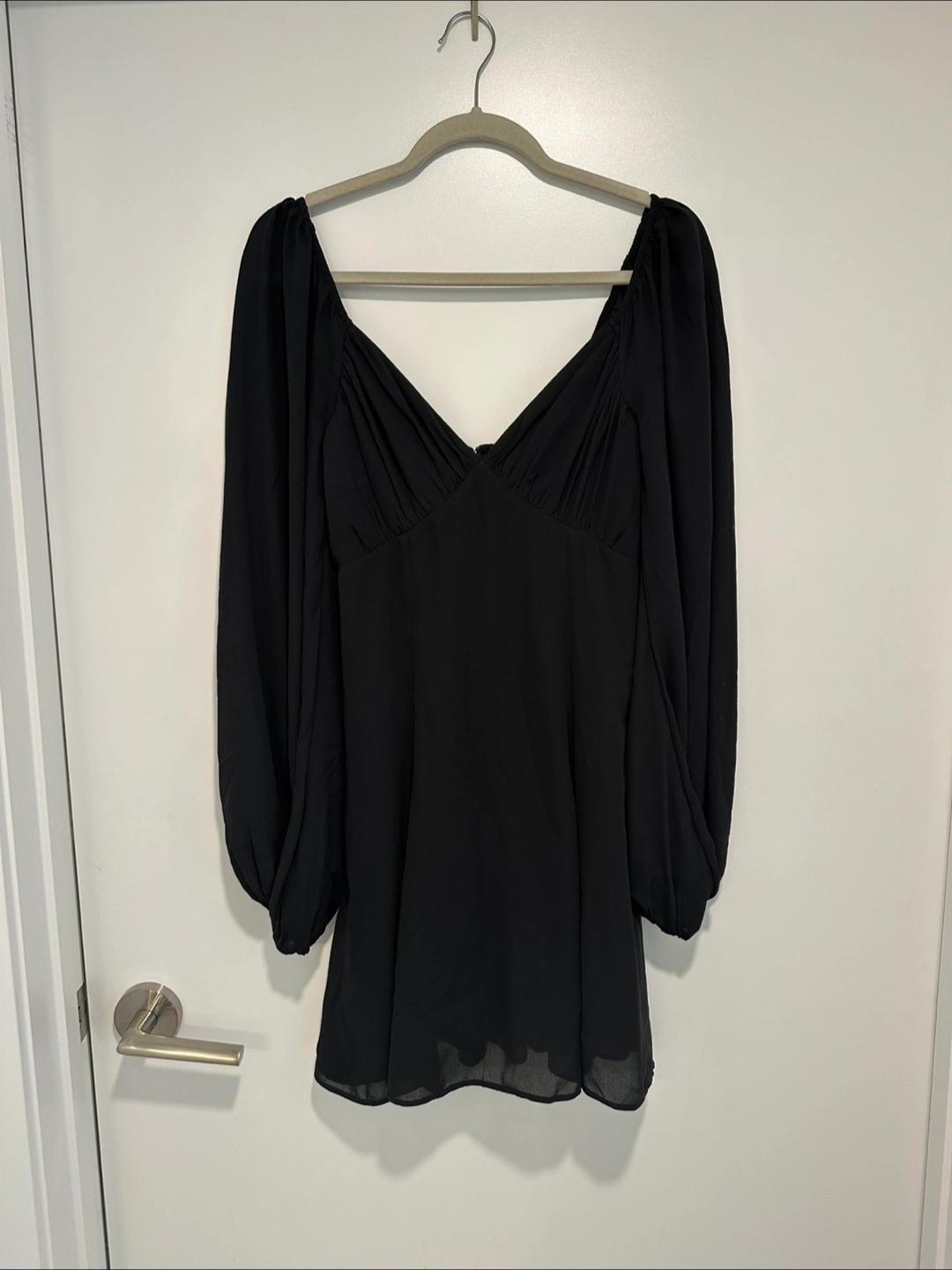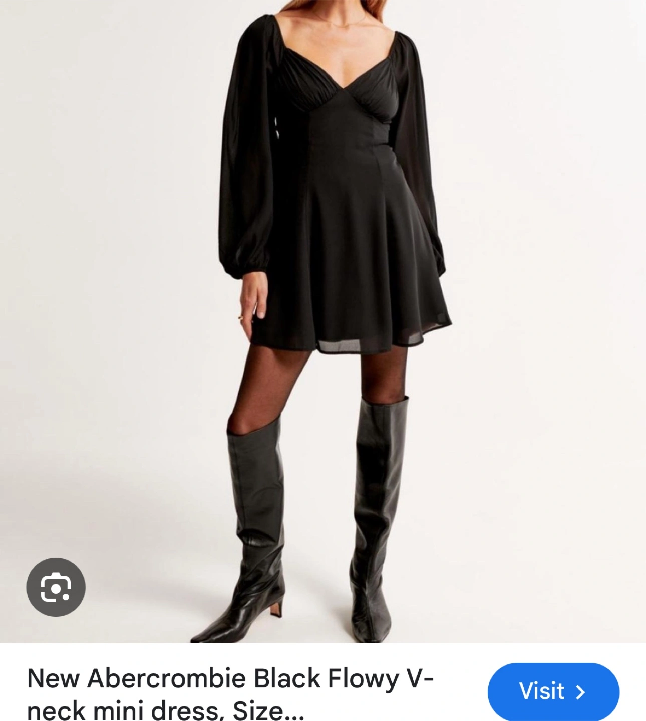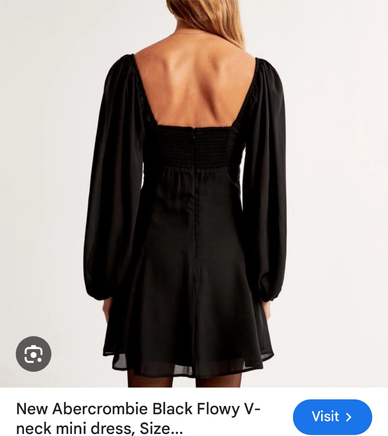 10Here's a cute Abercrombie black flowy V-neck mini dress! It has long sleeves and a flattering fit and flare shape. Perfect for a night out or a special occasion