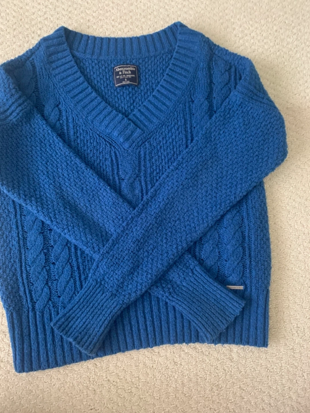 Selling a comfy blue V-neck sweater from Abercrombie & Fitch! It's a size small. The cable knit detailing adds a nice touch!