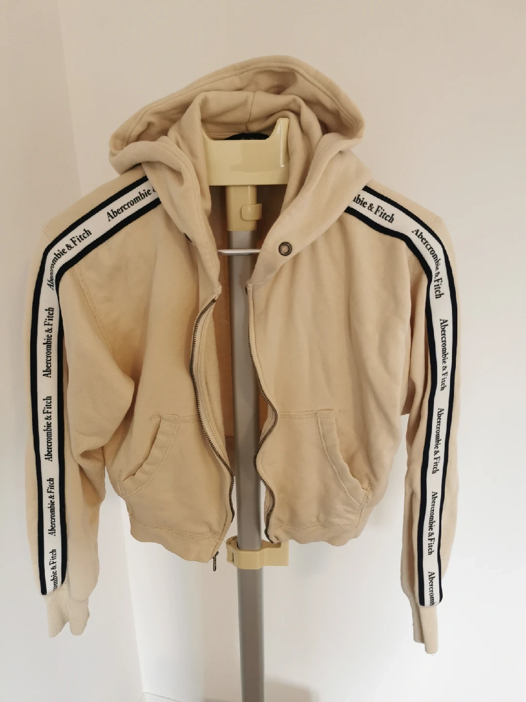 Cozy Abercrombie & Fitch hoodie in a lovely beige colour! It's a size small and features the brand name along the sleeves. Cropped.