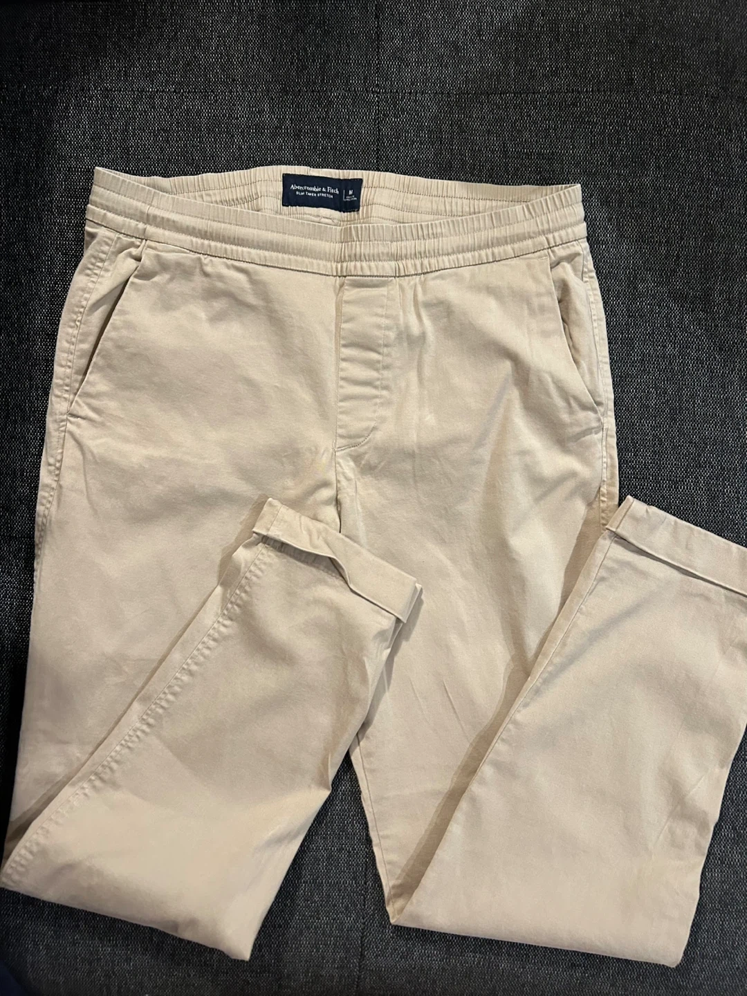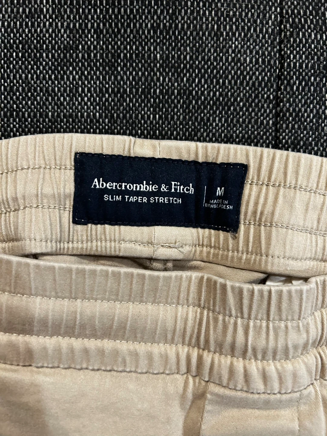 10Selling a pair of Abercrombie & Fitch slim taper stretch pants in size medium. They're in great shape and ready for a new home! Details: • Fit: Regular fit with stretch for added comfort • Color: beige • Material: Stretch cotton blend • Waist: Elastic waistband • Style: Casual / Smart casual • Closure: Pull-on style with faux fly • Pockets: Two front pockets, two back pockets