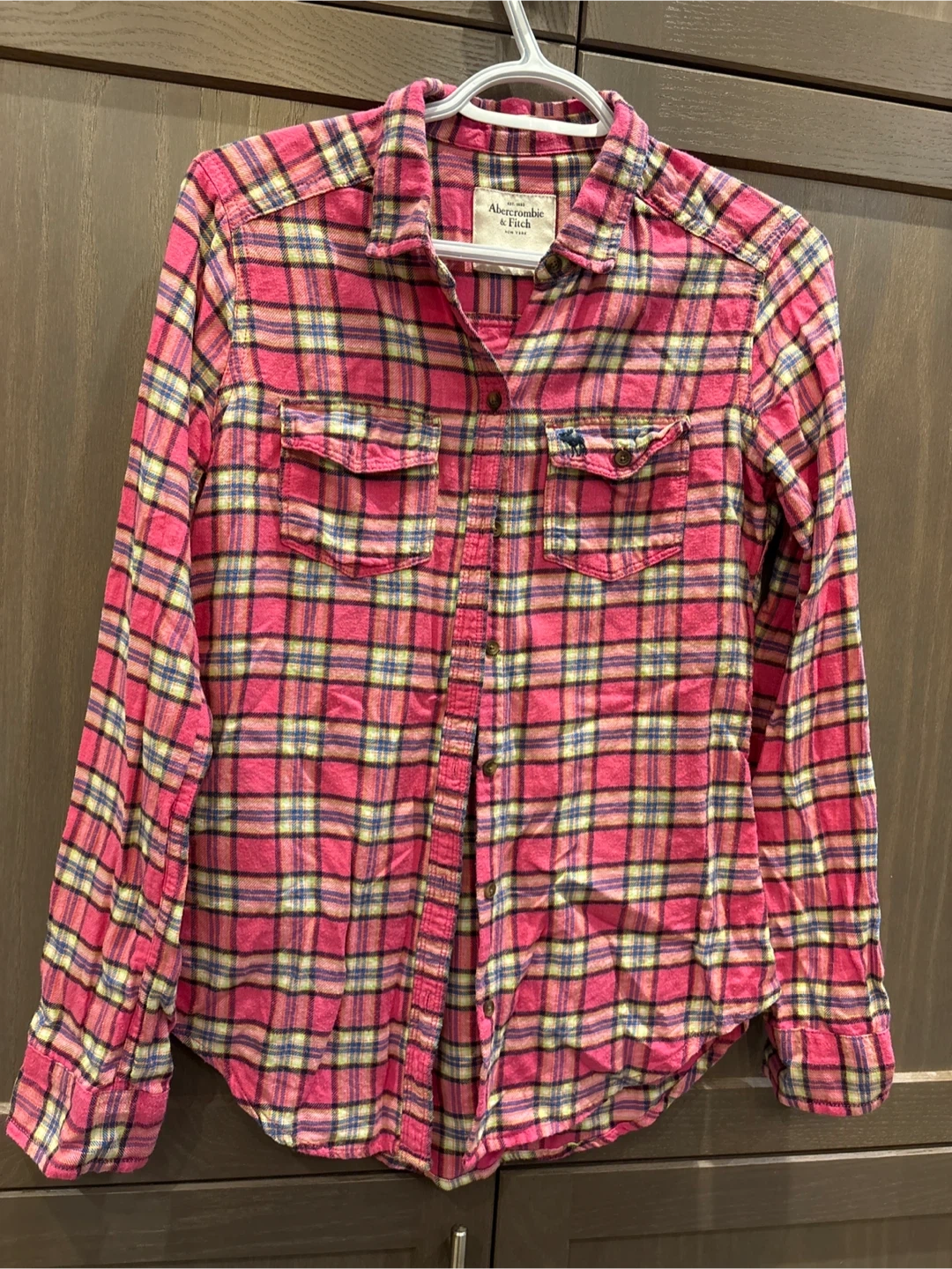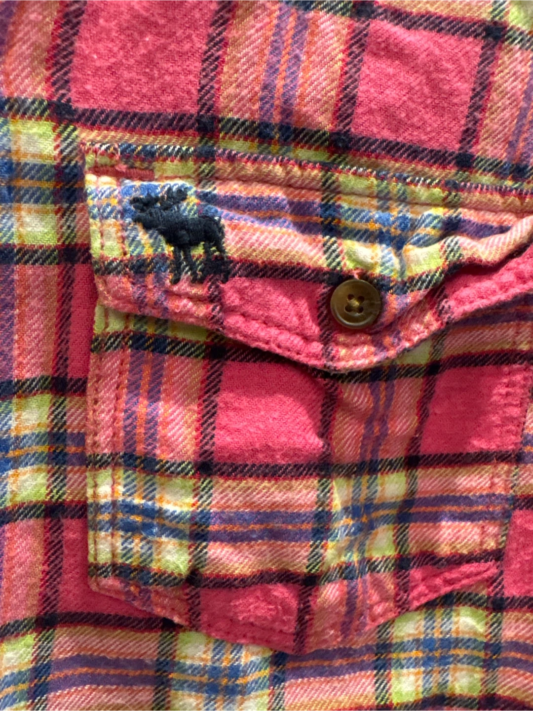 20Abercrombie & Fitch flannel shirt! It features a pink plaid pattern with a classic button-down style. The material is soft and comfortable, perfect for layering or wearing on its own.
