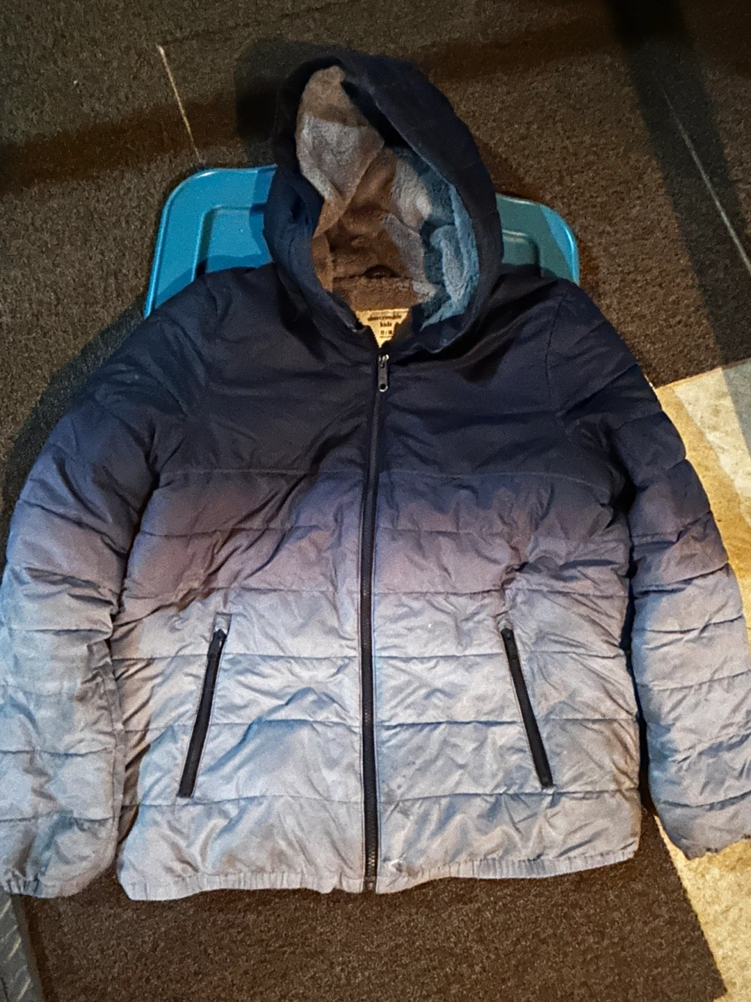 414Selling an Abercrombie Kids puffer jacket in size 17/18. It's a stylish gradient from dark blue to light grey. The jacket features a hood and a soft, warm lining, perfect for keeping cozy during colder weather. It's made with wind and water-resistant fabric and has recycled fill! Cash only Pick up Mississauga