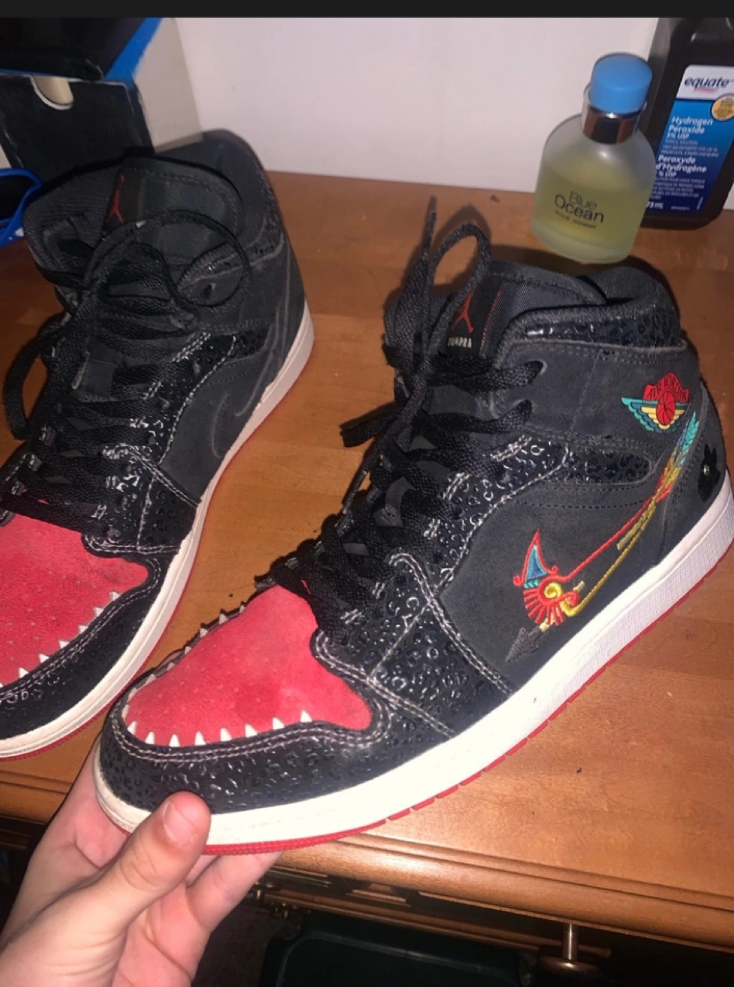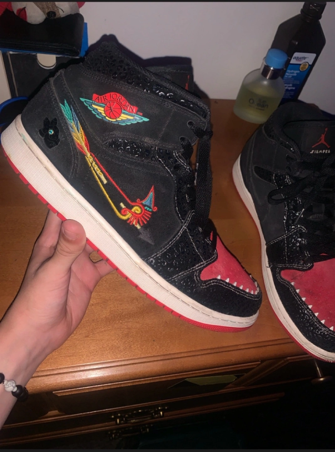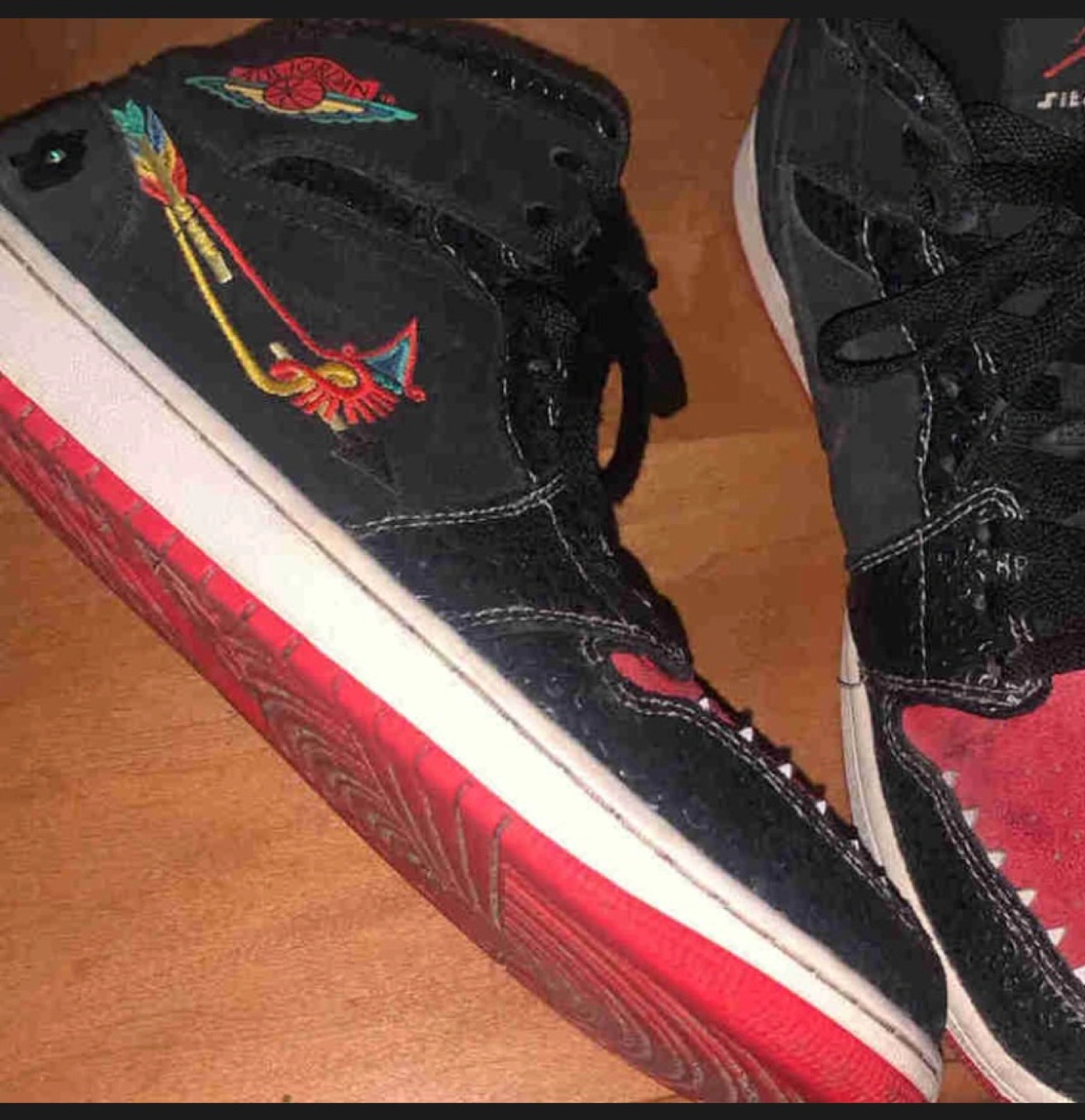Black and red Air Jordan 1 Retro High with embroidered details. No box but nice kept clean