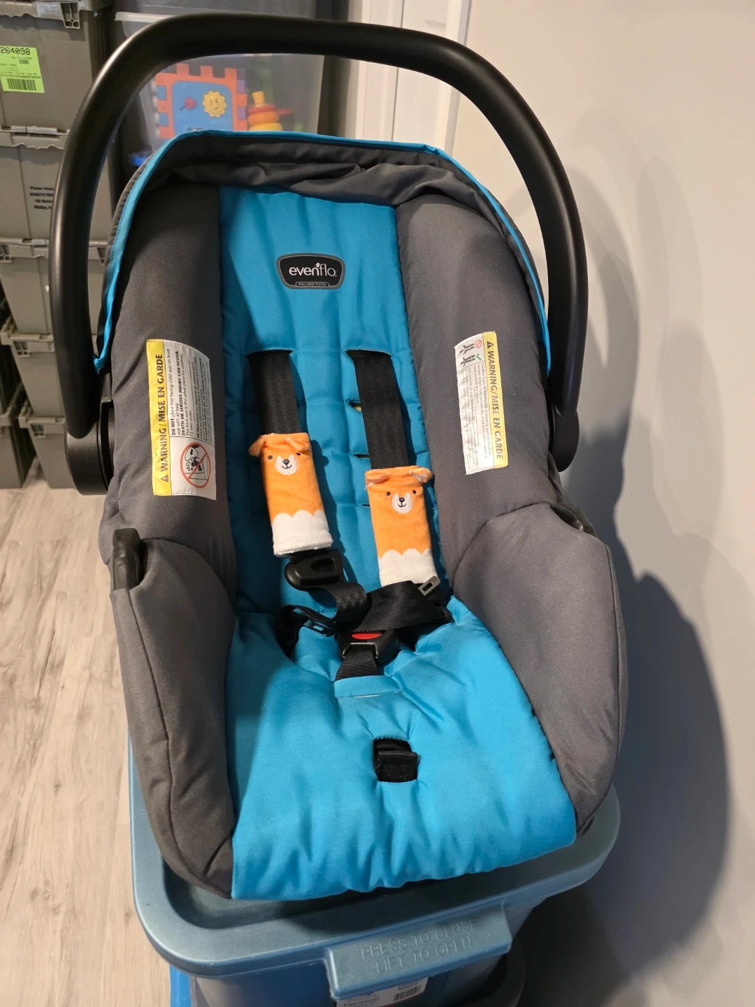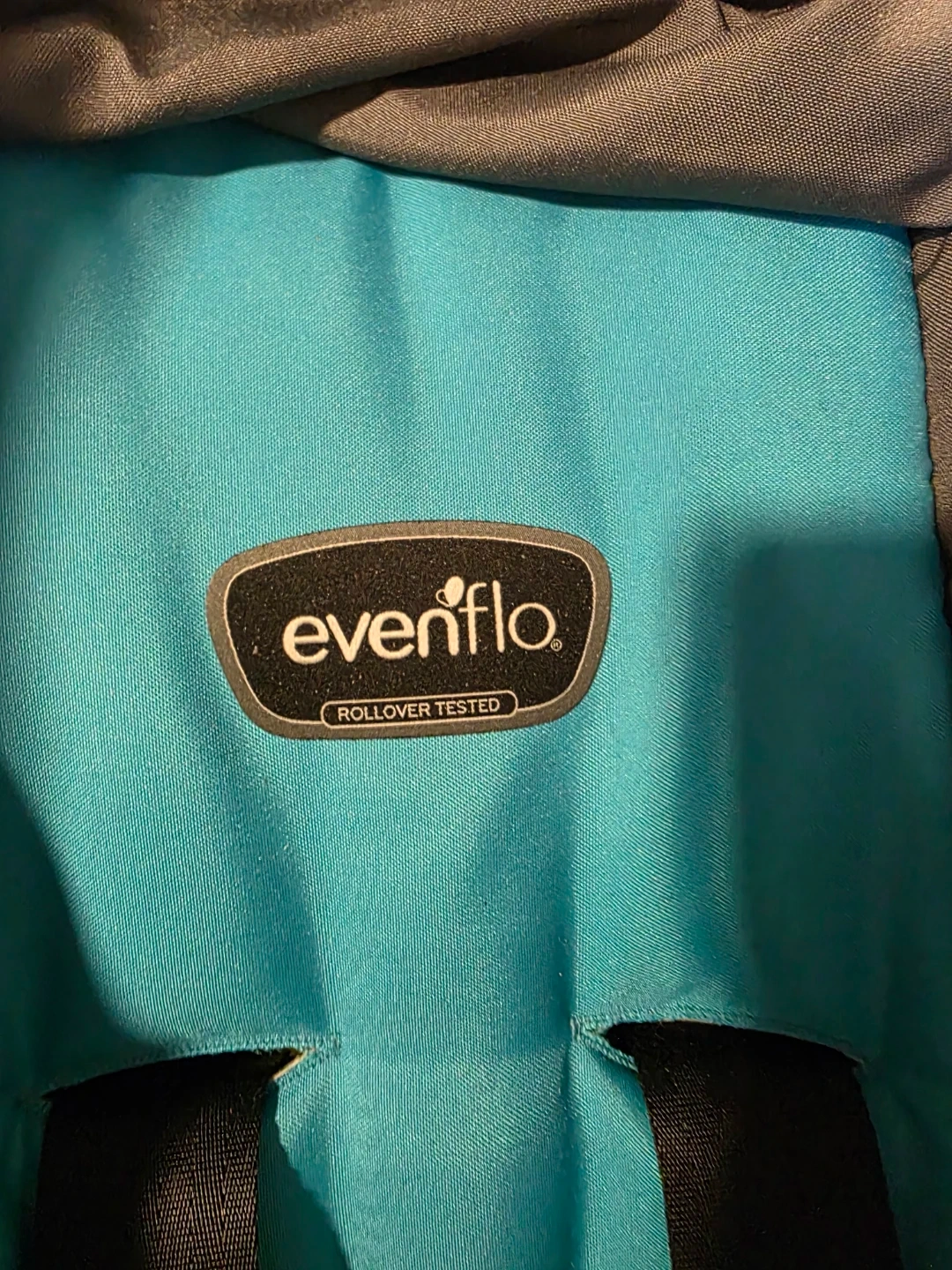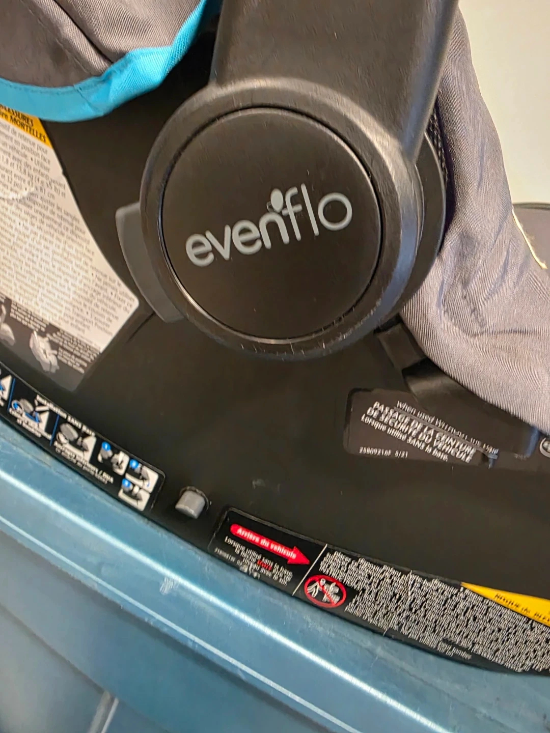 Evenflo infant car seat in grey and blue. Includes a rollover-tested design. Manufactured in 2022, this car seat is suitable for infants.