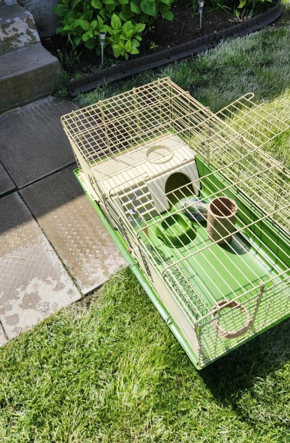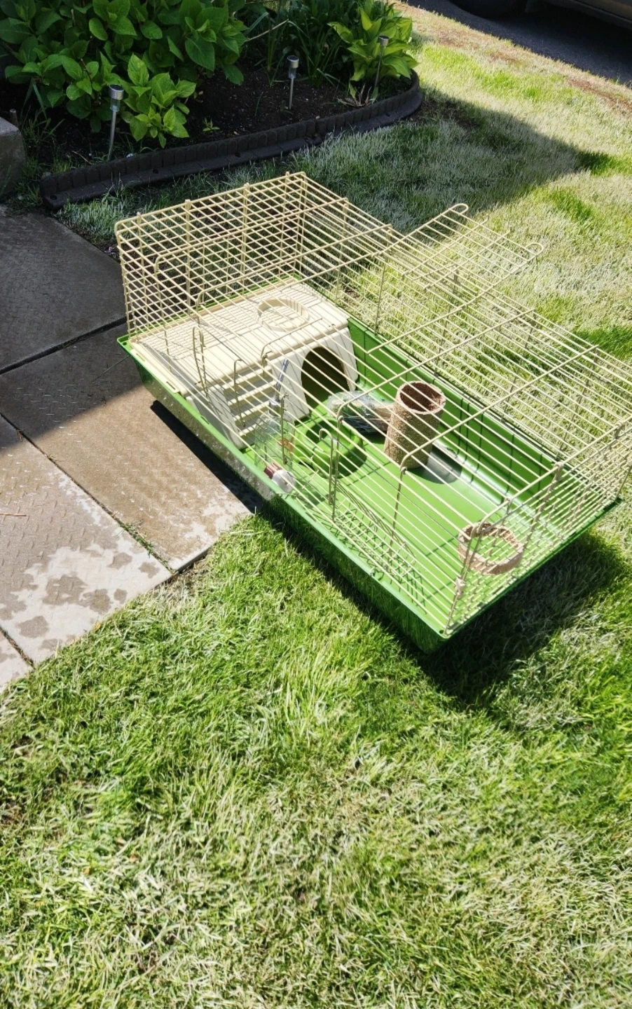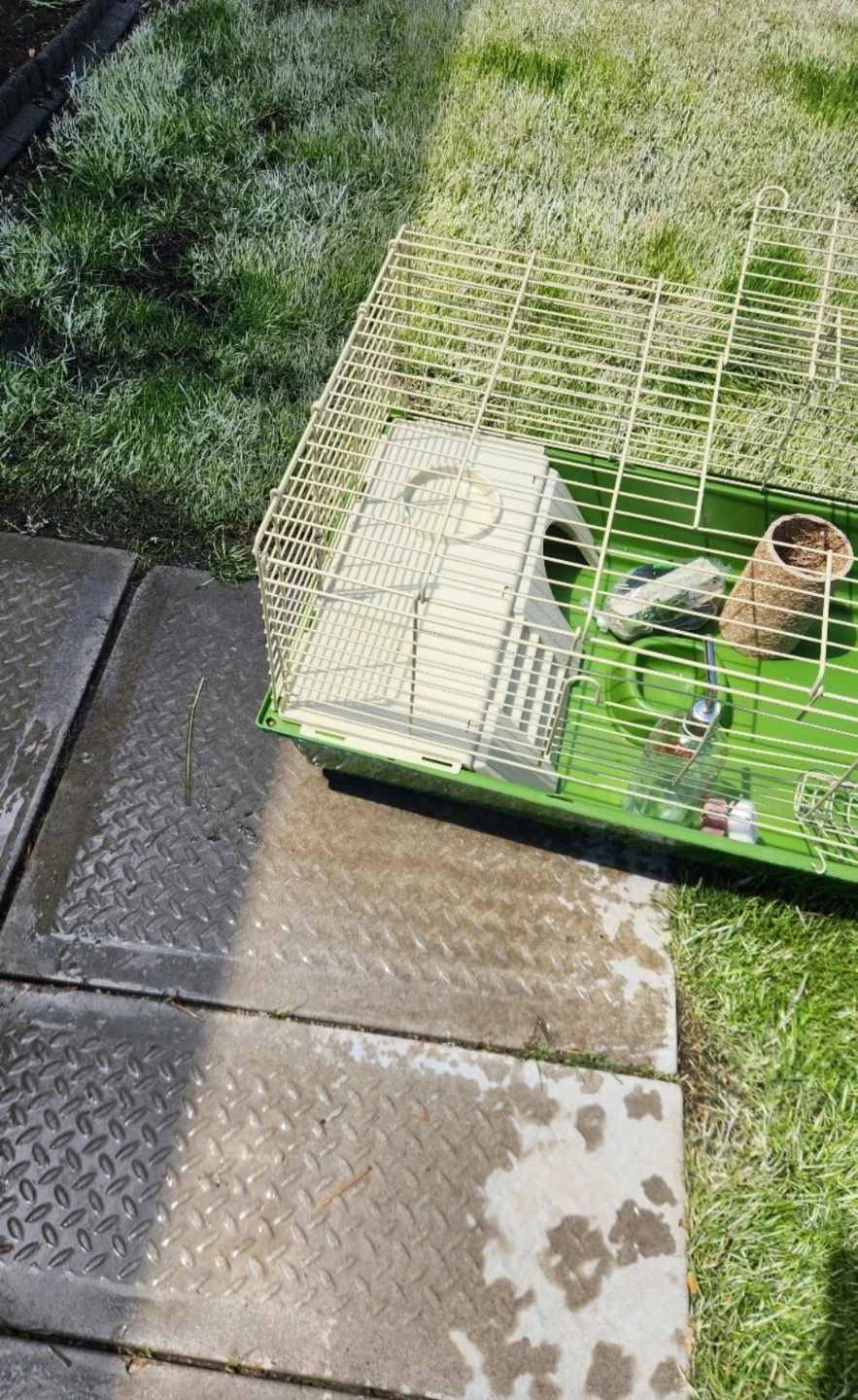 This is a hamster cage that includes a water bottle, food dish, and various accessories. It features a deep plastic base for bedding and a wire top. The cage offers a habitat for small pets.