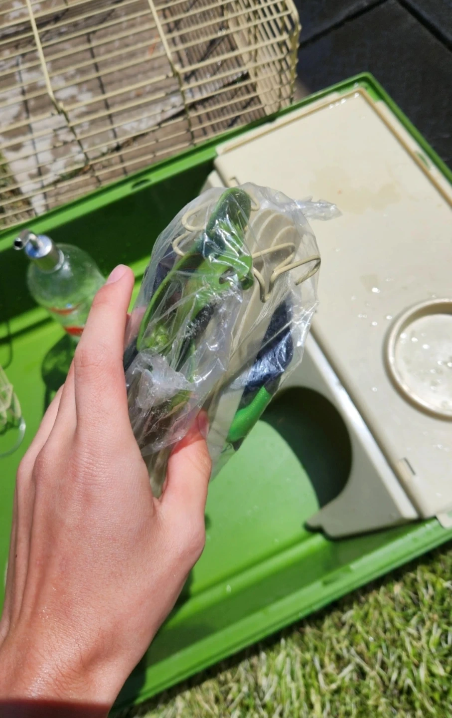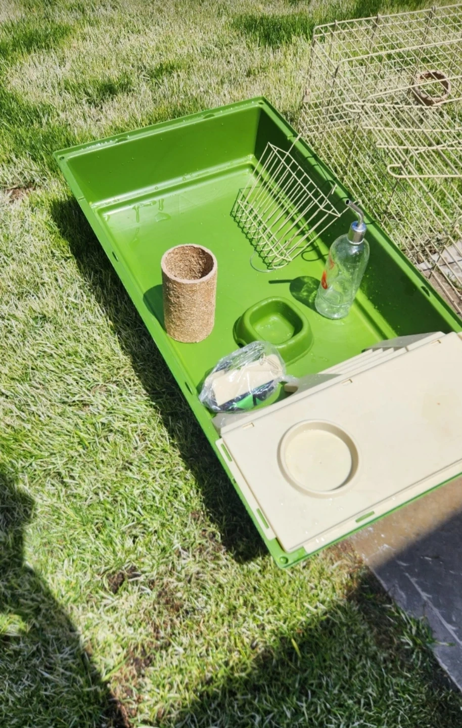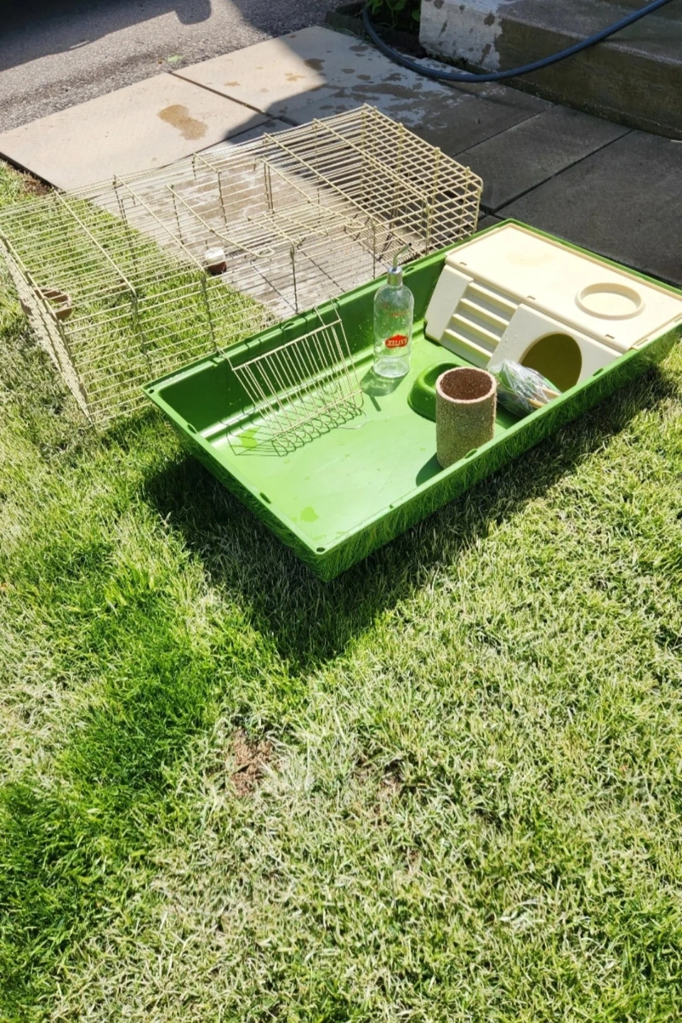 This is a hamster cage that includes a water bottle, food dish, and various accessories. It features a deep plastic base for bedding and a wire top. The cage offers a habitat for small pets.