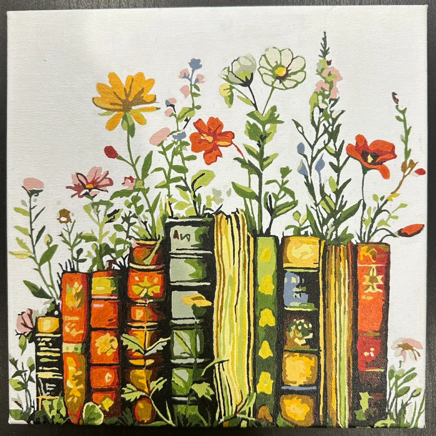 A charming canvas painting depicting a row of colourful books with various flowers growing out of them. The artwork features a vibrant palette and a whimsical theme. It's a delightful piece for any book lover or garden enthusiast!