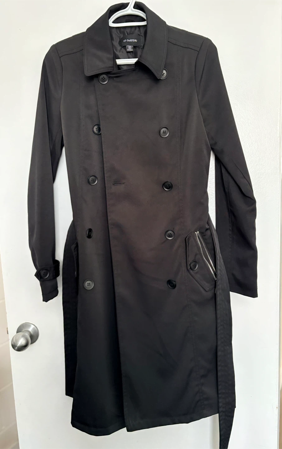Classic black trench coat from Le Chateau. It's in great condition and ready for a new owner. Perfect for those in-between weather days!