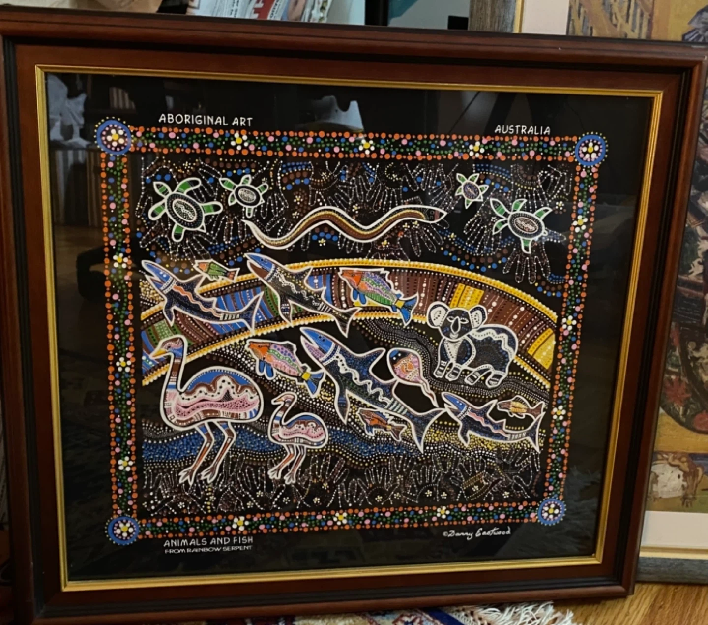 26Framed Aboriginal art print featuring animals and fish from the Rainbow Serpent. The artwork is colourful and detailed, with a dark background that makes the design pop. The frame is a dark wood colour.