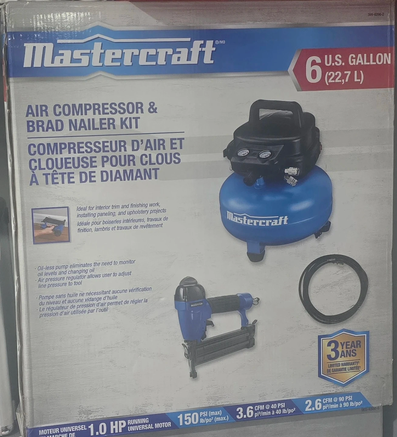 This Mastercraft kit includes an air compressor and a brad nailer. It features a 6 U.S. gallon tank and a 1.0 HP universal motor. The oil-less pump eliminates the need to monitor oil levels.