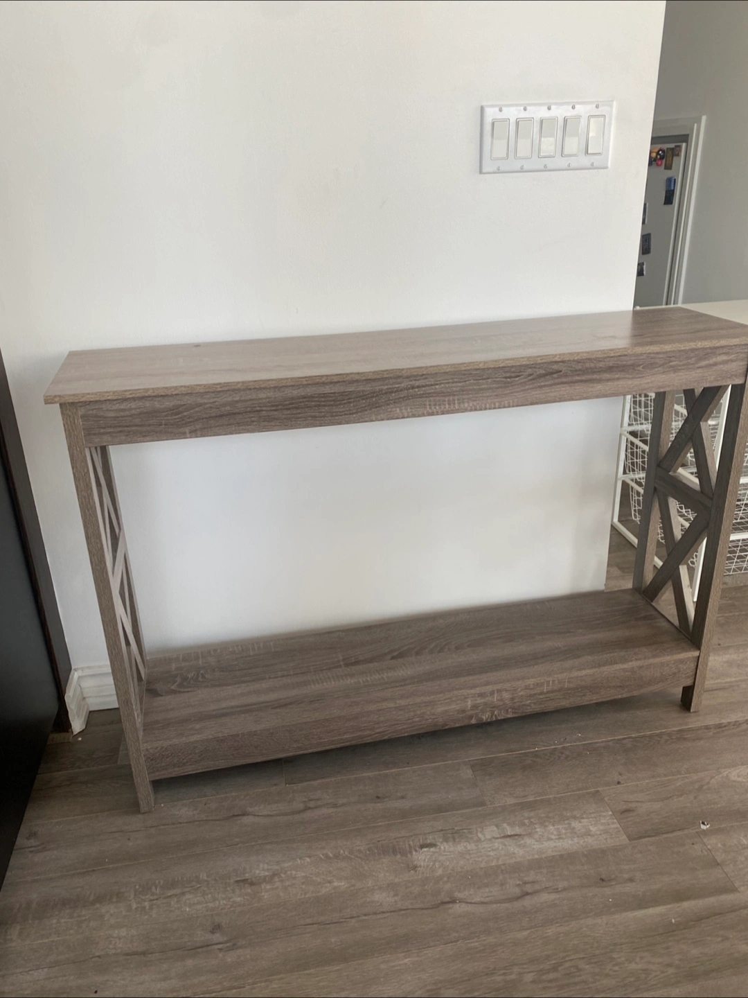 Here's a console table with a wood grain finish! It features a lower shelf for extra storage or display space. It's in great shape and ready for a new home!