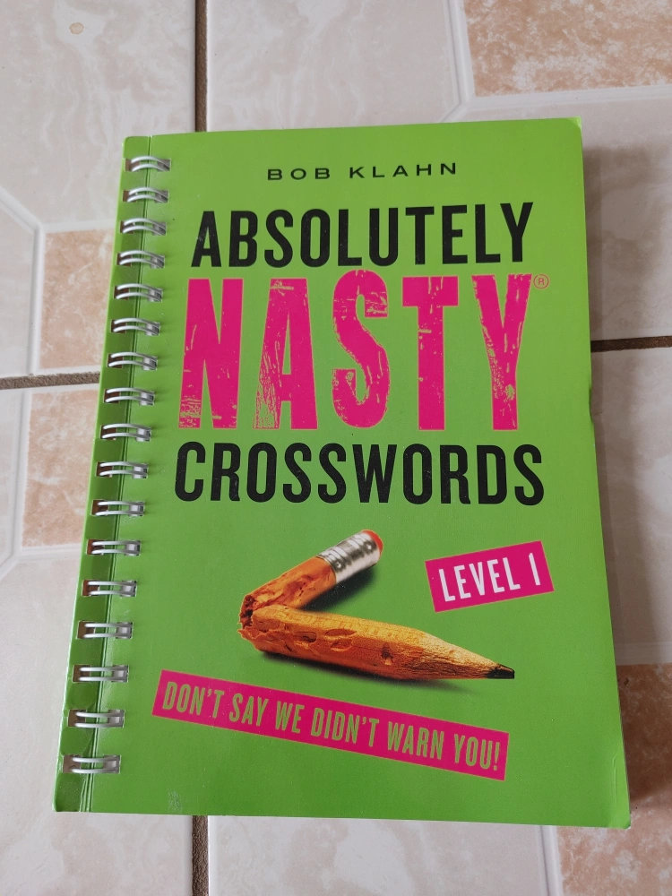 Selling a copy of Absolutely Nasty Crosswords Level 1 by Bob Klahn! It's a spiral-bound book full of challenging puzzles and quirky humour. Get ready for some brain-teasing fun! Bought for a gift, but it was never used.