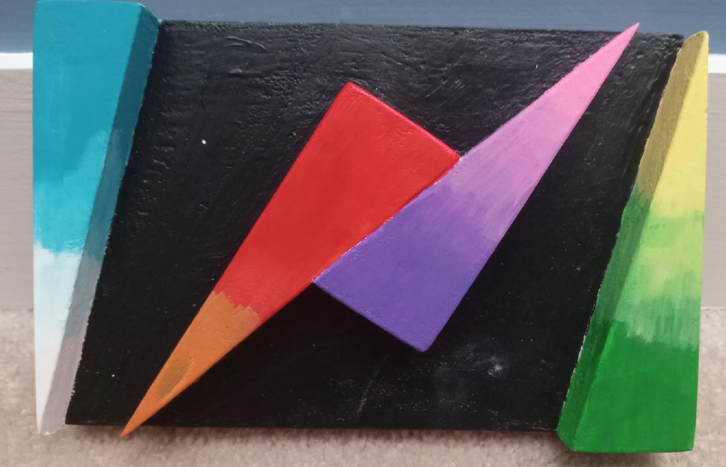 15This is a colourful abstract 3D geometric painting. It features triangles in red, purple, green, and blue, of varying shades against a black void allowing the colours to pop vibrantly.