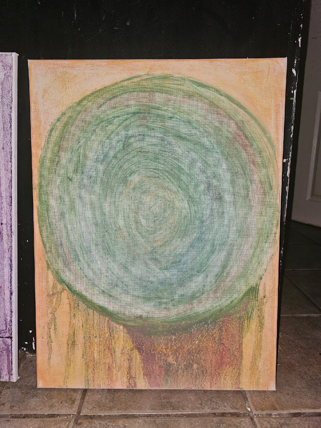 I'm selling a unique piece of abstract art painted on canvas. The artwork features a captivating green swirl design with earthy tones, perfect for adding a touch of creativity to any space